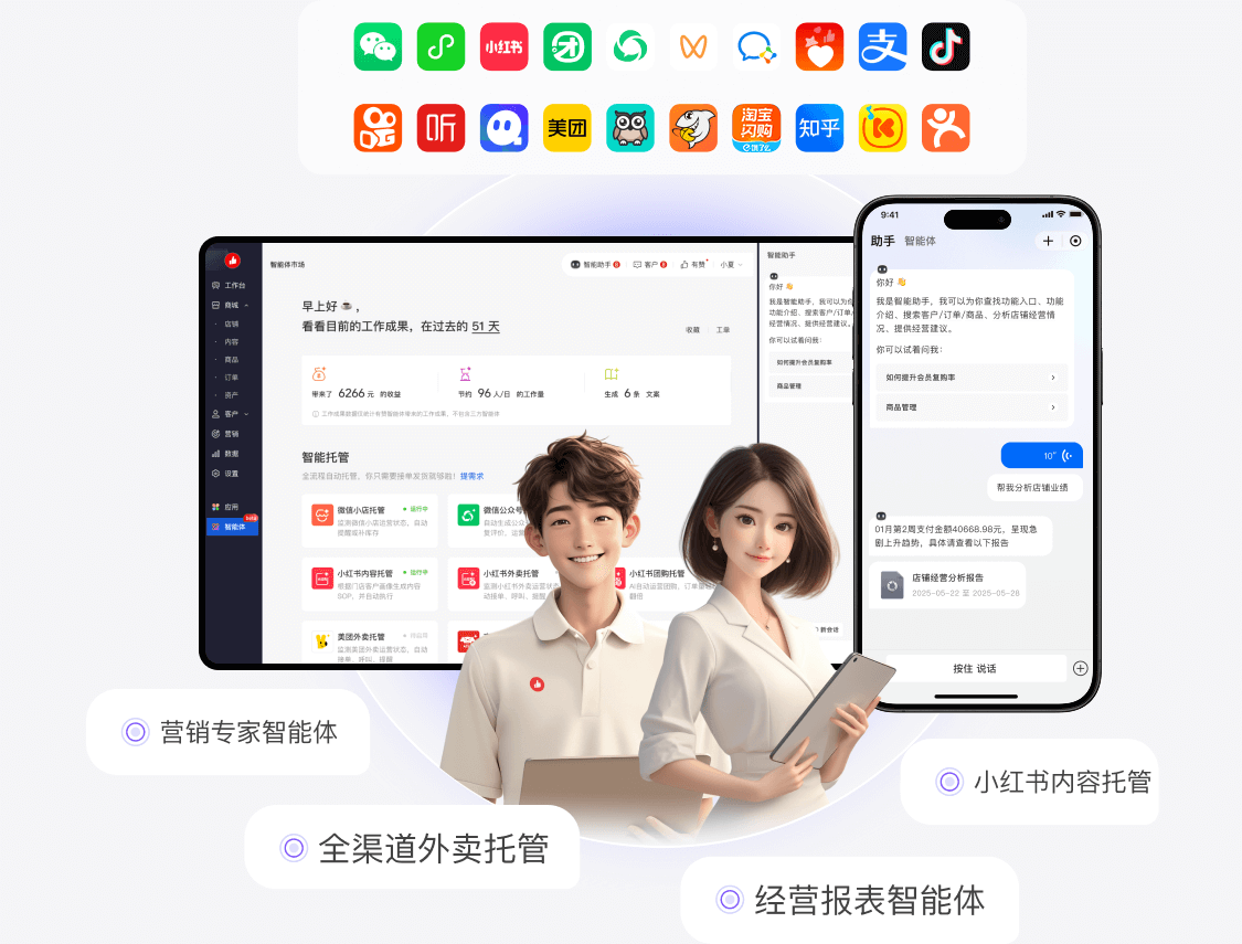 通过到店顾客智能写内容和智能打卡、智能托管全网外卖店店铺、智能托管AI销售和客服等公域获客系统, 帮助商家做好公域获客,不断增长。