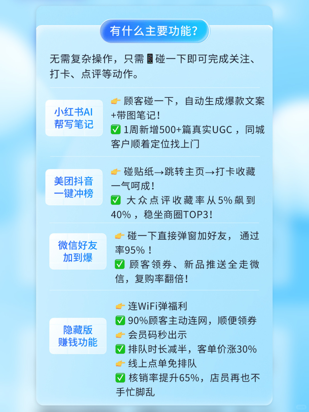 🧲3. 碰一碰直接加私域,转化率高达95%! 不用再“扫我二维码”,顾客只要碰一下,就弹窗加好友! 📢新品试吃、优惠券、生日祝福一键群发,复购率直接翻倍💥