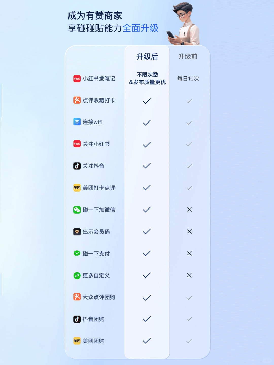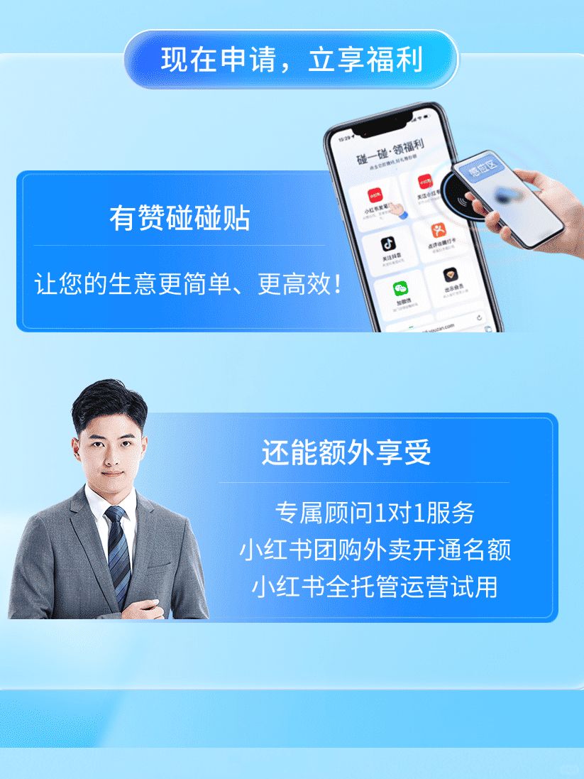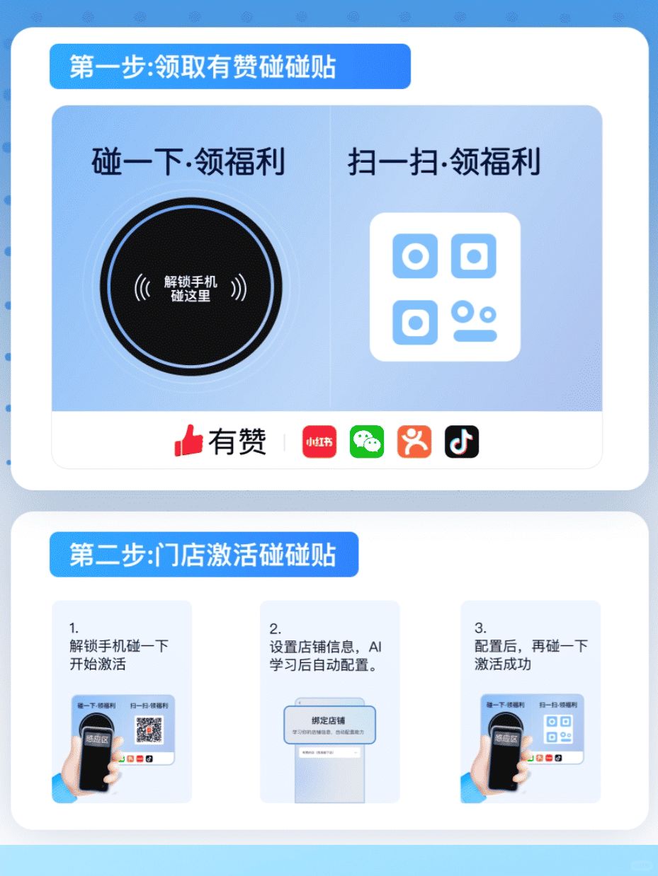 以前店里推活动,要么贴海报要么求顾客扫码;想冲个点评榜还得一条条私聊求点评😭。员工忙,顾客懒,效果感人……但今天你可以用有赞碰碰贴!💥