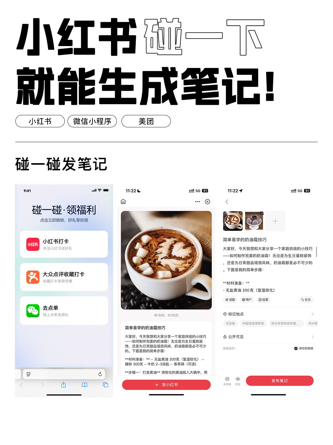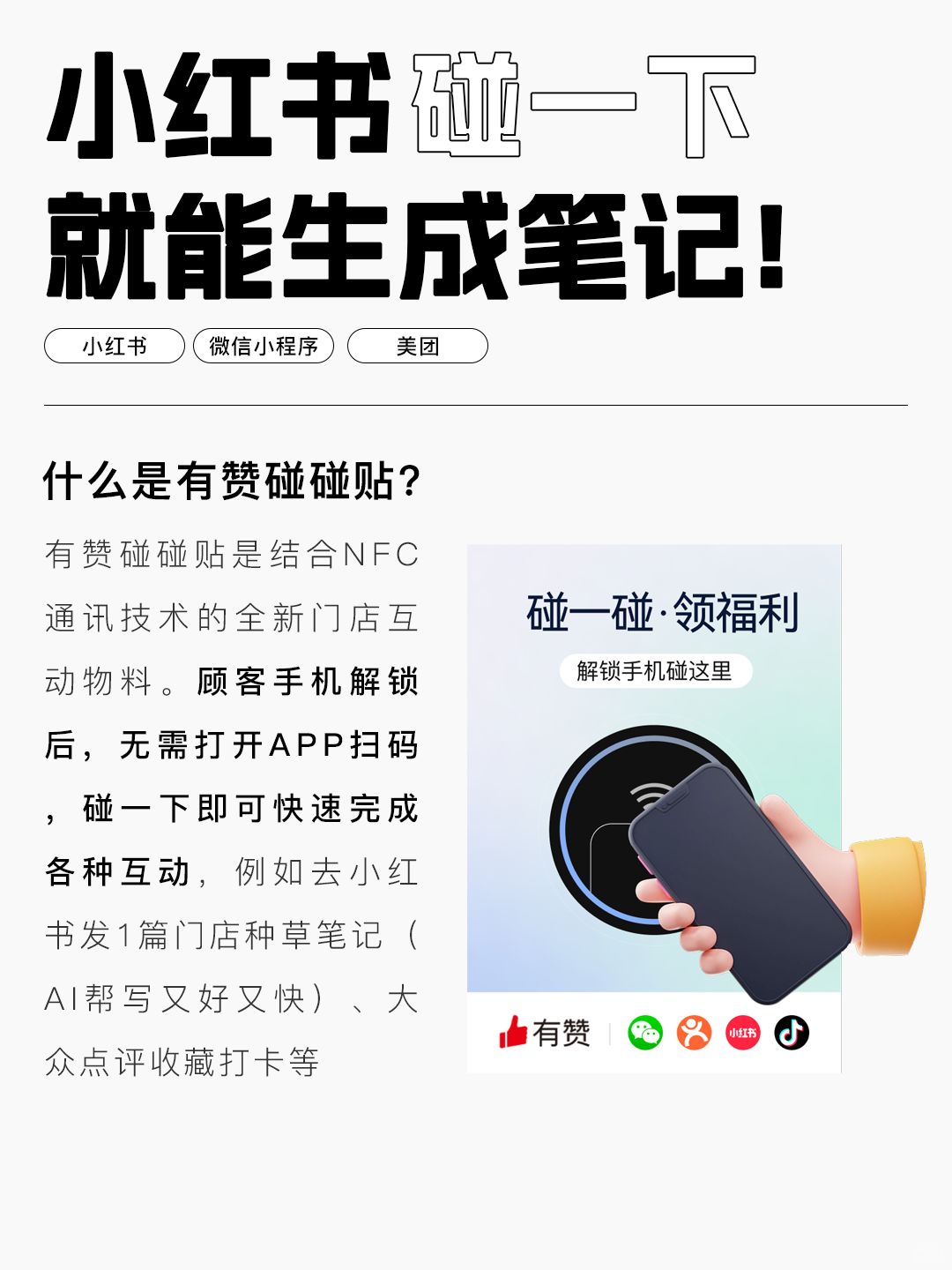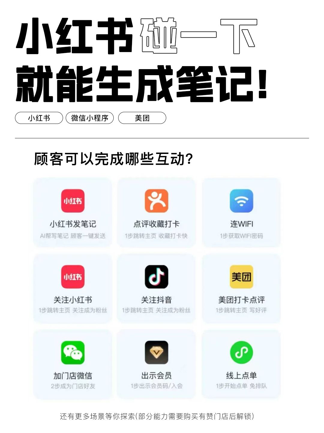 ⭕AI自动生成小红书笔记:顾客通过手机一碰碰碰贴,即可自动生成小红书笔记,1分钟发布种草内容,将线下客流秒变线上曝光。