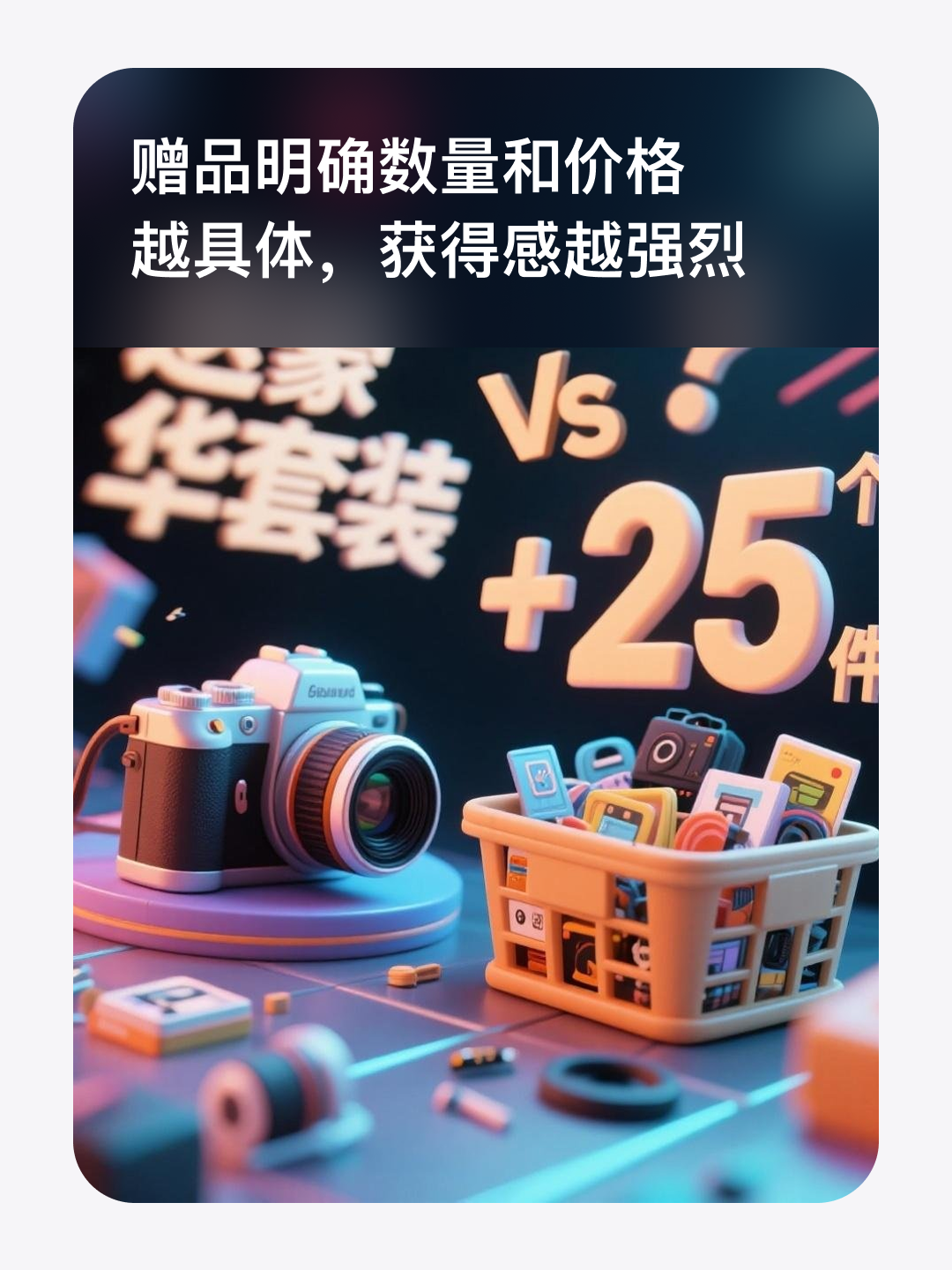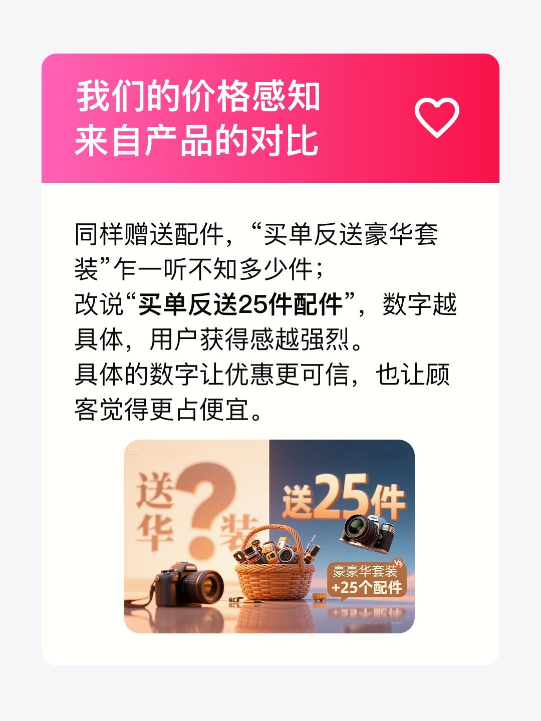 送赠品也一样。说“买单反送豪华套装”,大家不确定值多少钱。换个说法,“买一送二十五”,明确告诉用户送多少件,获得感立马提高。数字越具体,感觉越实在。