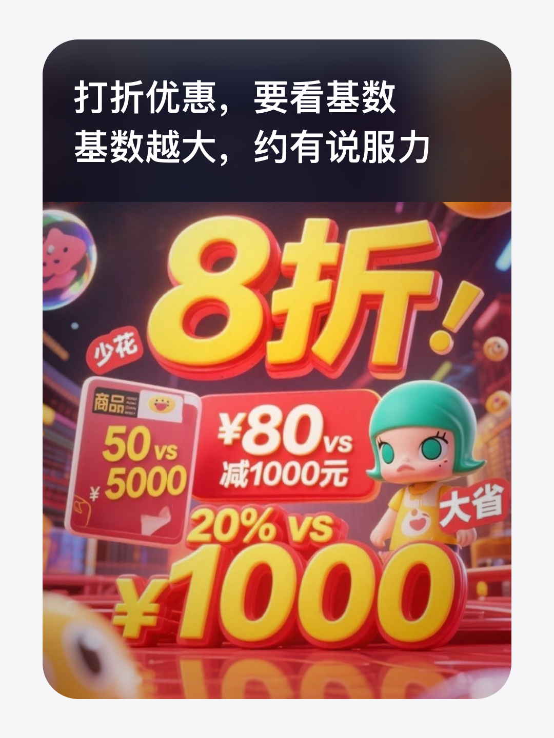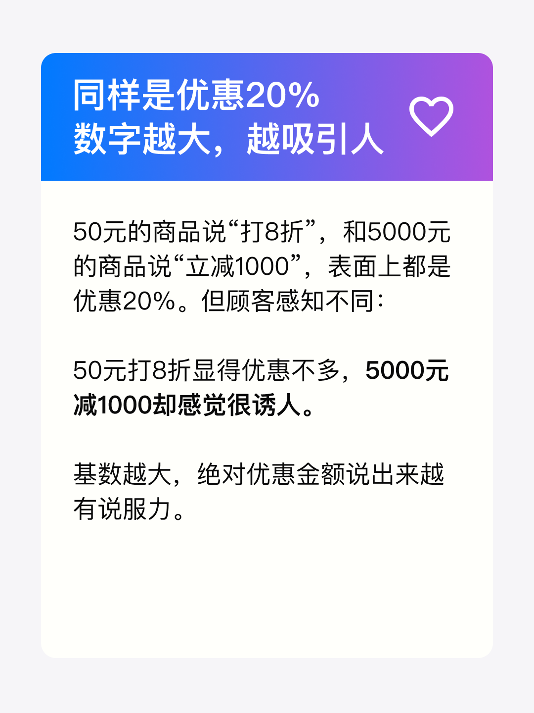 价格打折也一样。50块的商品直接说“打八折”,不会有太强感受。但5000块的商品如果说“立减1000”,同样是八折,顾客的反应完全不同。大金额面前,要让用户看到具体省了多少,而不是打了几折。