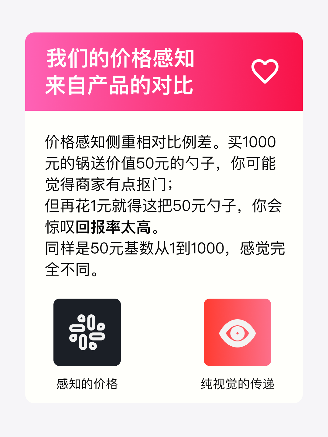 比如你卖一口锅1000块,送一个50块钱的勺子,顾客会觉得小气。可你换一种方式:再花1块钱送这个勺子,顾客立马觉得划算。明明都是同一个勺子,差别只在描述方式不同。