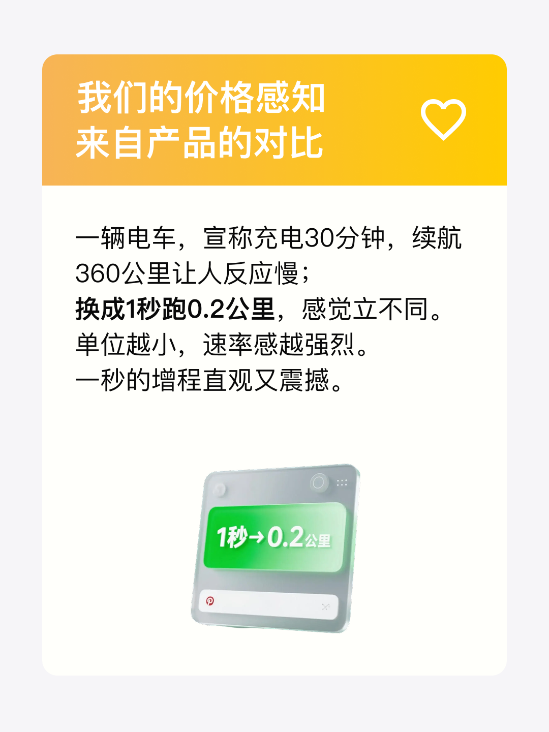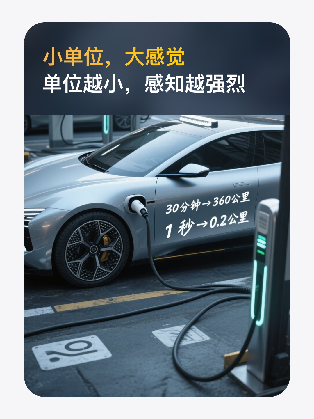 再比如充电续航。如果你说“30分钟能充360公里”,用户不一定反应得过来。但你换个说法,“1秒充进2公里”,立刻觉得性能惊人。单位换小了,速度感就被放大了。