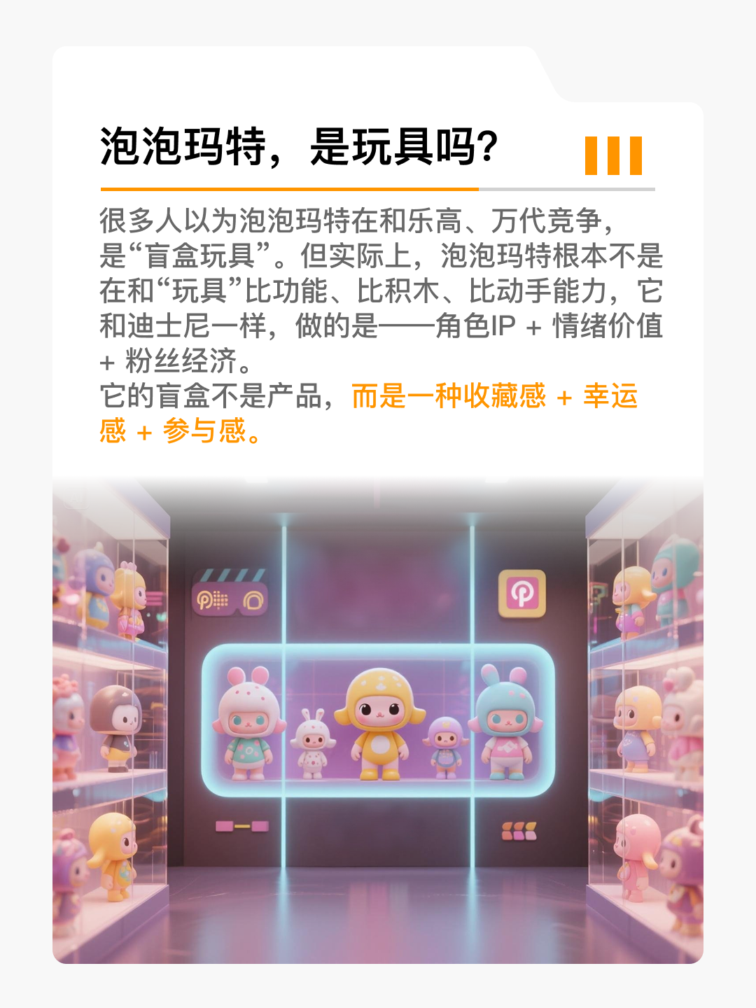 很多人以为泡泡玛特是在做玩具,其实人家从一开始就没把自己放在“玩具”品类,而是放在“潮流IP收藏”这条赛道上。