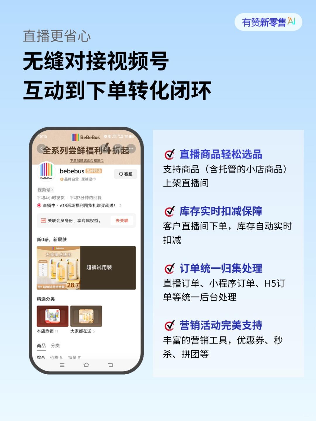 1个智能体支持绑定3个微信小店账号,再也不用一个个登录后台了。只需要在有赞后台操作一次,选择“一键同步”,所有的商品信息、价格、库存就会自动、实时地同步到所有绑定的微信小店里!再也不怕库存超卖,也不怕价格标错了