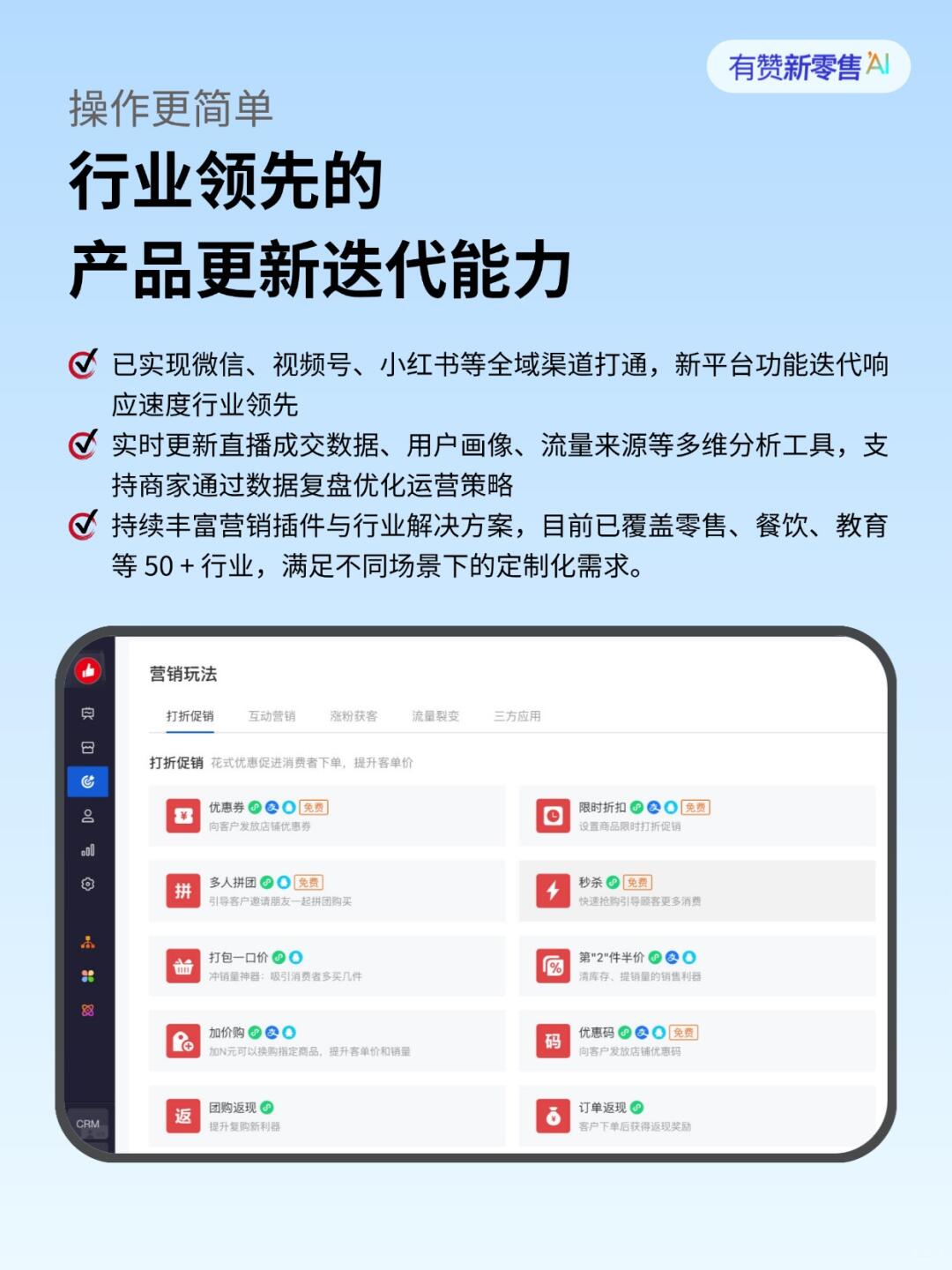 后台有超多营销工具,拼团、秒杀、优惠券…市面上主流的营销玩法它几乎都有!📈我最喜欢它的分销功能,让老客户、朋友都成为我的“销售员”,一传十,十传百,流量不就自然来了吗?轻轻松松就把公域平台的流量,转化成私域会员