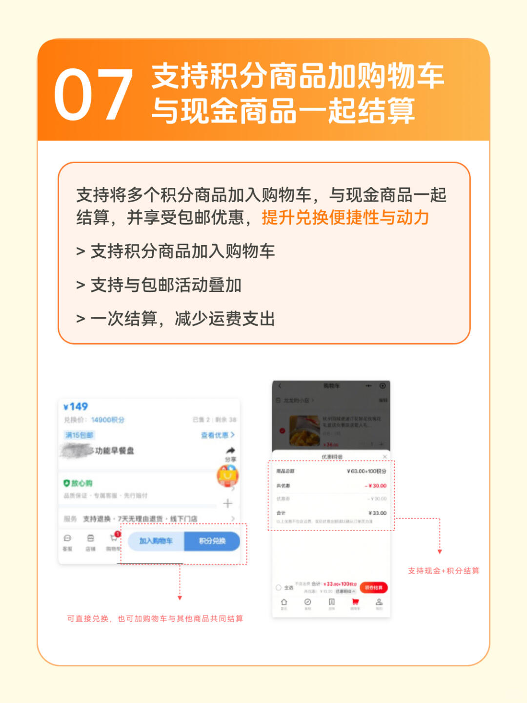 💰 客单up!up! 积分商品加入购物车🛒,和现金商品一起结算!还能叠加包邮,刺激消费杠杠滴!