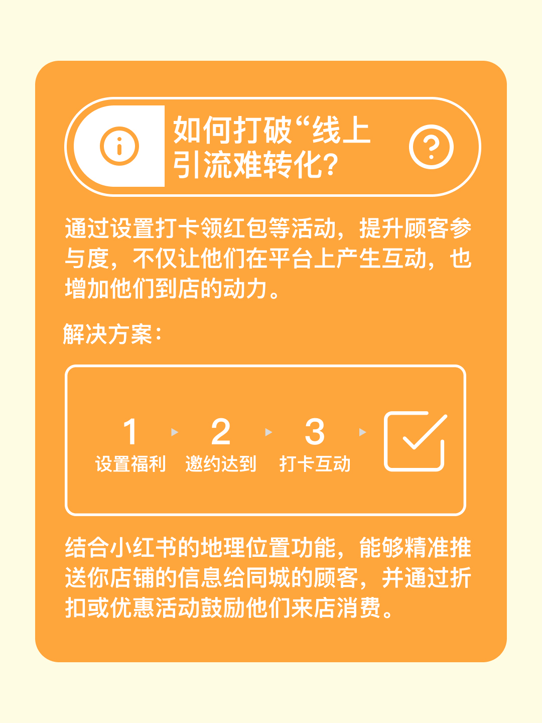 小红书不再仅仅是一个打卡和领红包的平台,它是品牌建立、顾客教育的好帮手。通过持续的互动、创意活动,你能把线上流量转化成稳定的到店客流。给你的顾客留下深刻印象,打造真正的品牌粘性,提升复购率,长期运营才是王道!