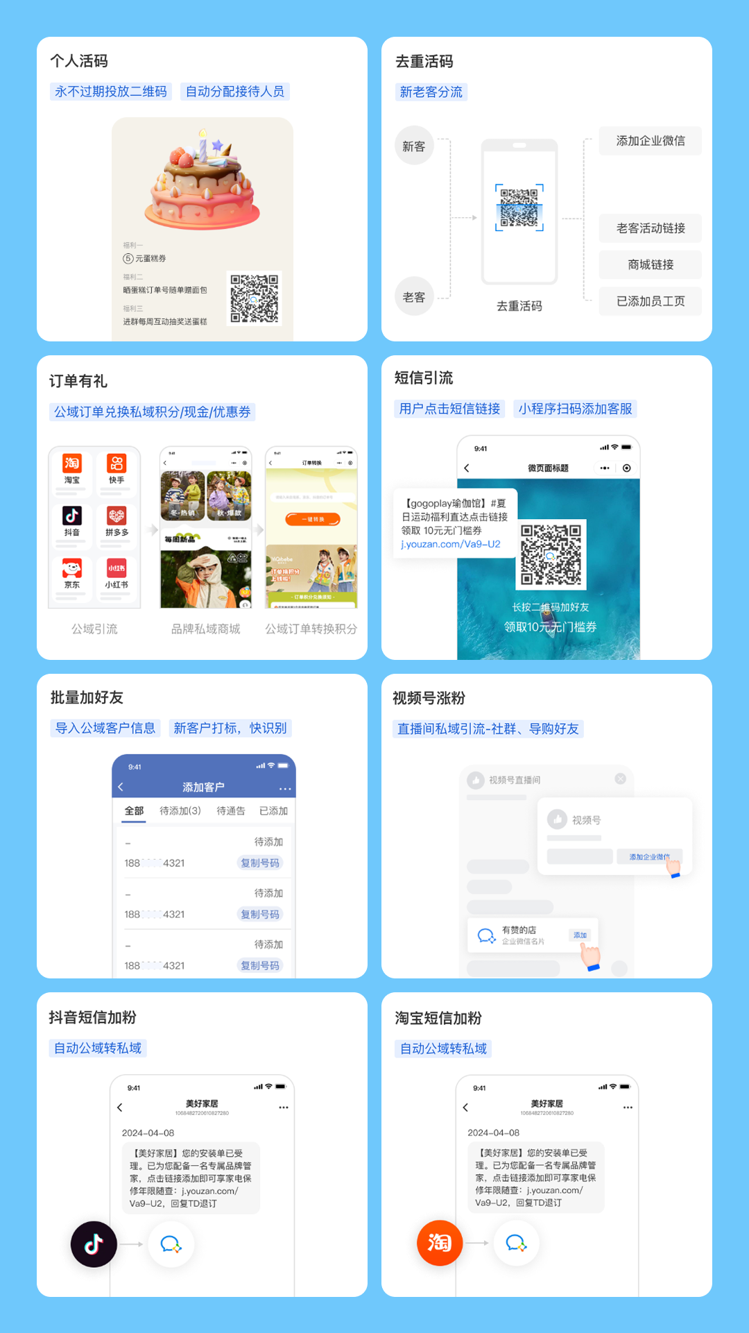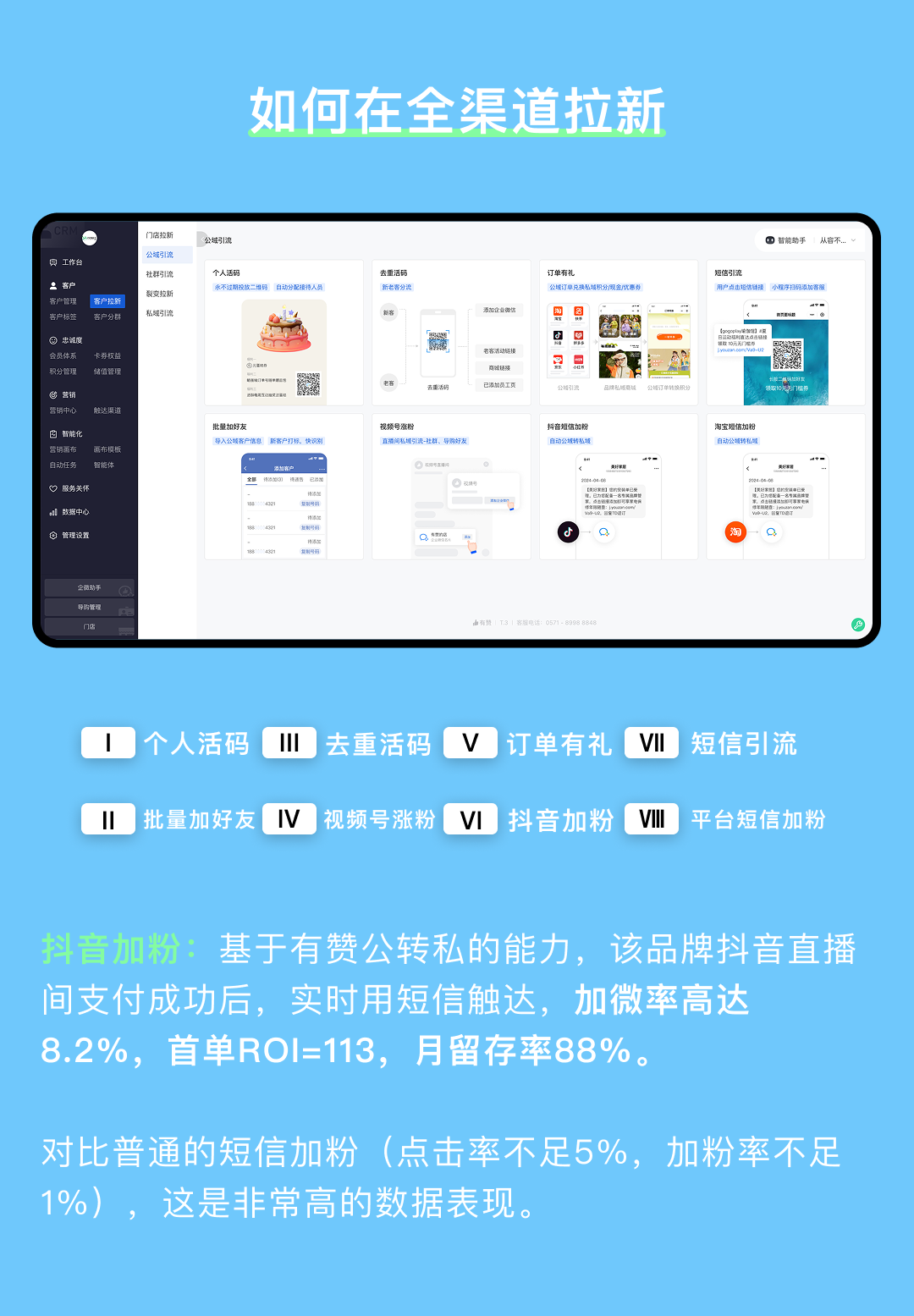 先把包裹卡当成最便宜且稳的获客入口,把它做成有质感、和品牌一致的触点,只发给正价客户或特定订单,把私域首单的小福利做成限量、带时效的激励,让顾客觉得“留下来有好处”。配合抖音直播的实时短信加粉:客户在直播间付款后马上发短信引导加微,这个时机能把加微率推到高位(你们已经看到过 8% 的加微率),效果远好过事后群发。不要拼命追数量,追精准——高价值的 20% 要先抓住。