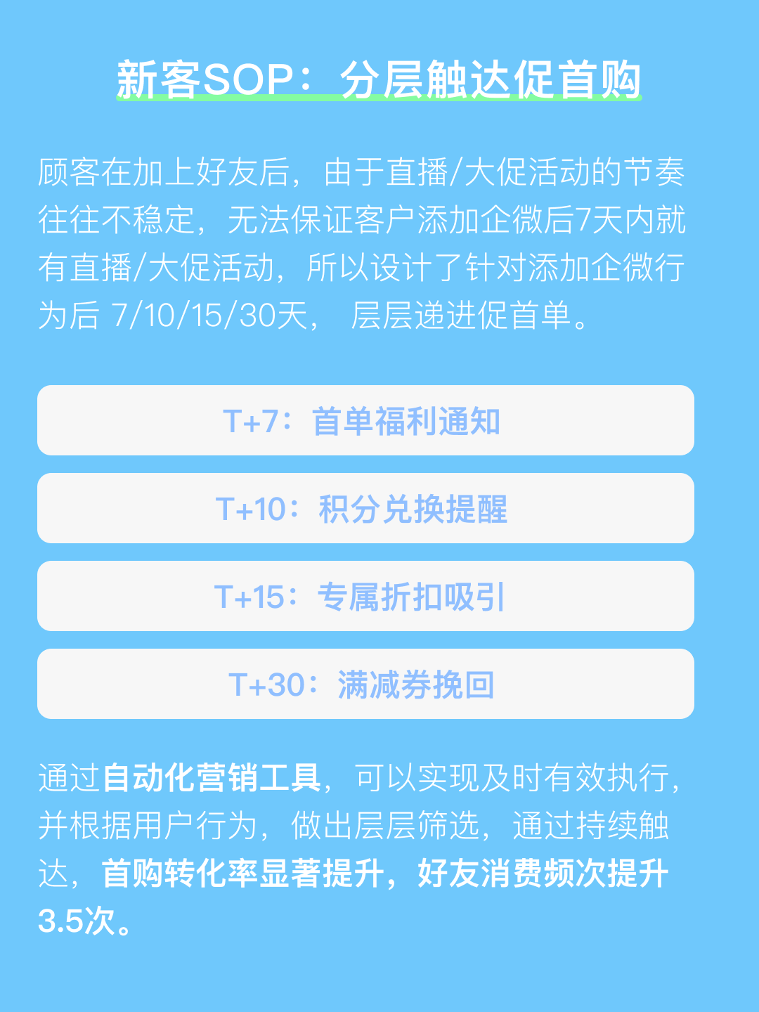新客加为好友后不要放着,设计一个节奏化的触达流程,把“加好友”快速转化成首单。加了好友后的一周左右先推首单福利,再用积分、专属折扣、满减券等在合适时机做二次刺激,最后用一次补刀式的挽回通知把犹豫的人唤回来。把这个节奏自动化,省人力又稳产出。关键是频率和内容要有层次感,别一次性把最大优惠给了,给的是节奏感和理由去下单。
