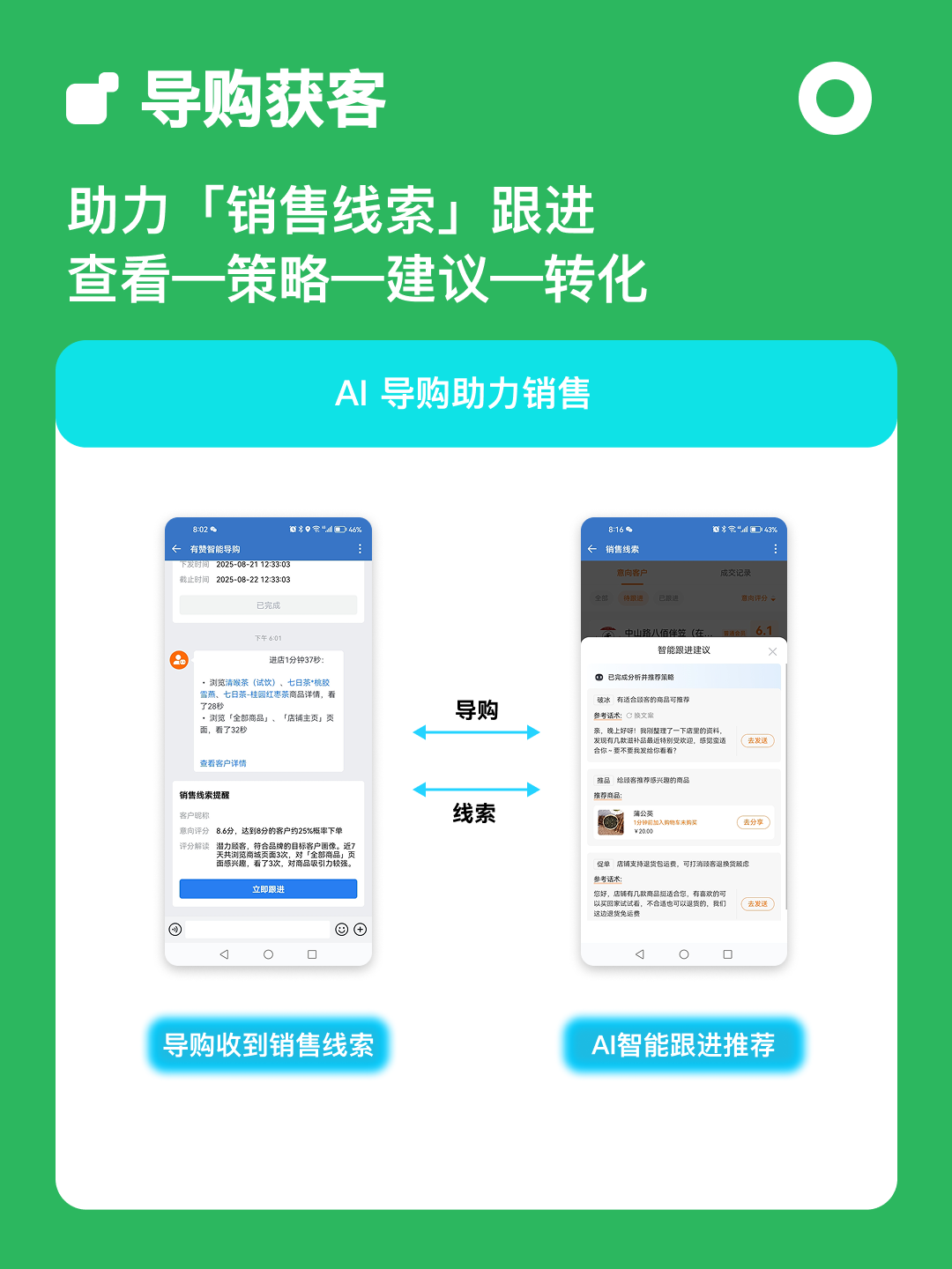 最妙的是“AI 线索”:系统会自动挑出最近浏览过商品、问过价格的顾客,标成“高意向”。导购收到提醒,直接按系统给的话术跟进,不用再猜顾客心思。八月他们试了试,高意向线索的成交将近三成,比过去翻了一倍。