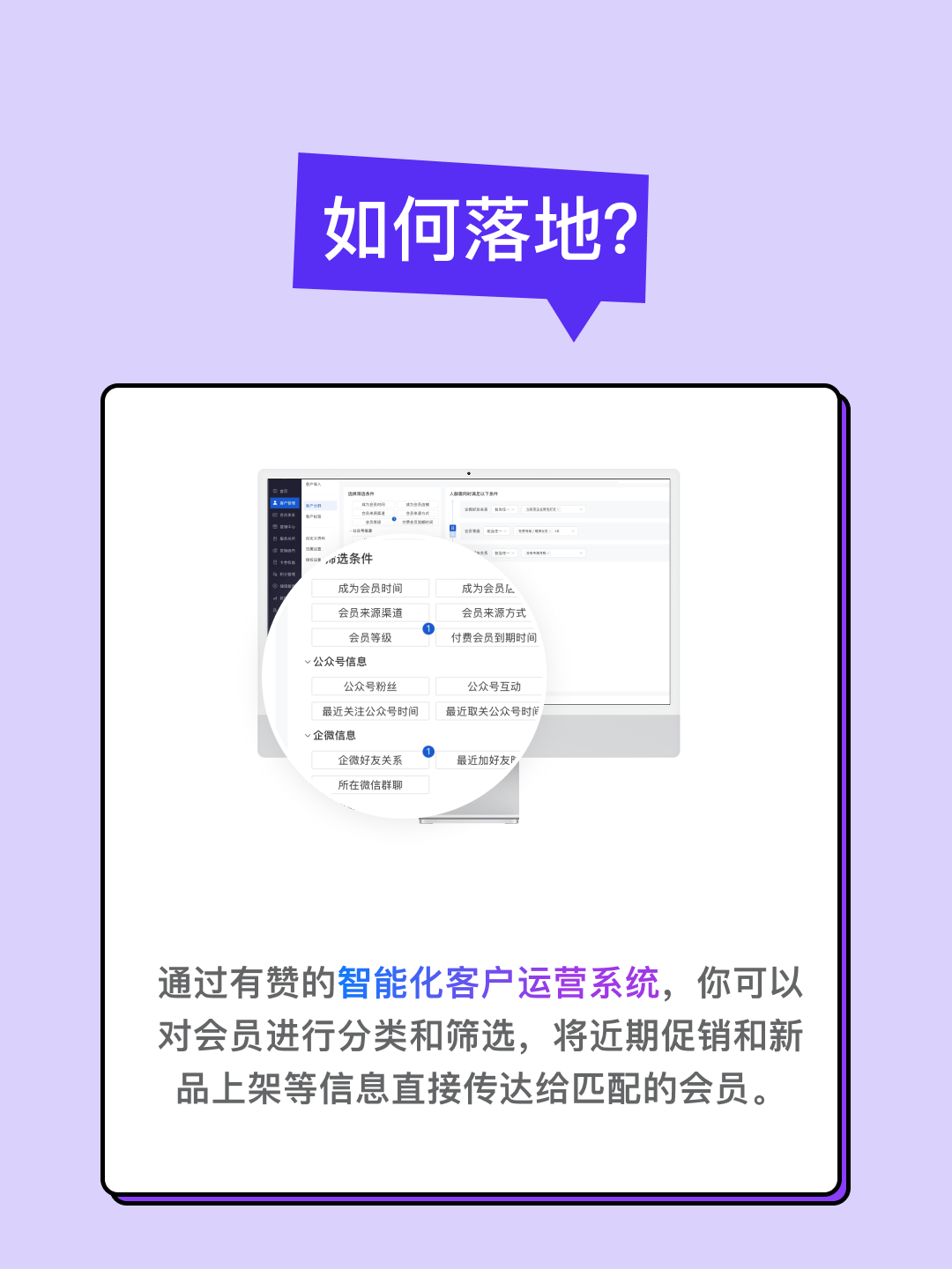 第四招,也是关键的一招,就是利用智能化客户运营系统。现在都什么年代了,咱也得跟上科技的潮流。通过智能化的系统,把会员进行分类和筛选,精准推送促销和新品信息,这就像给你的营销装上了“导航仪”,能让每一分投入都精准到达目标客户。