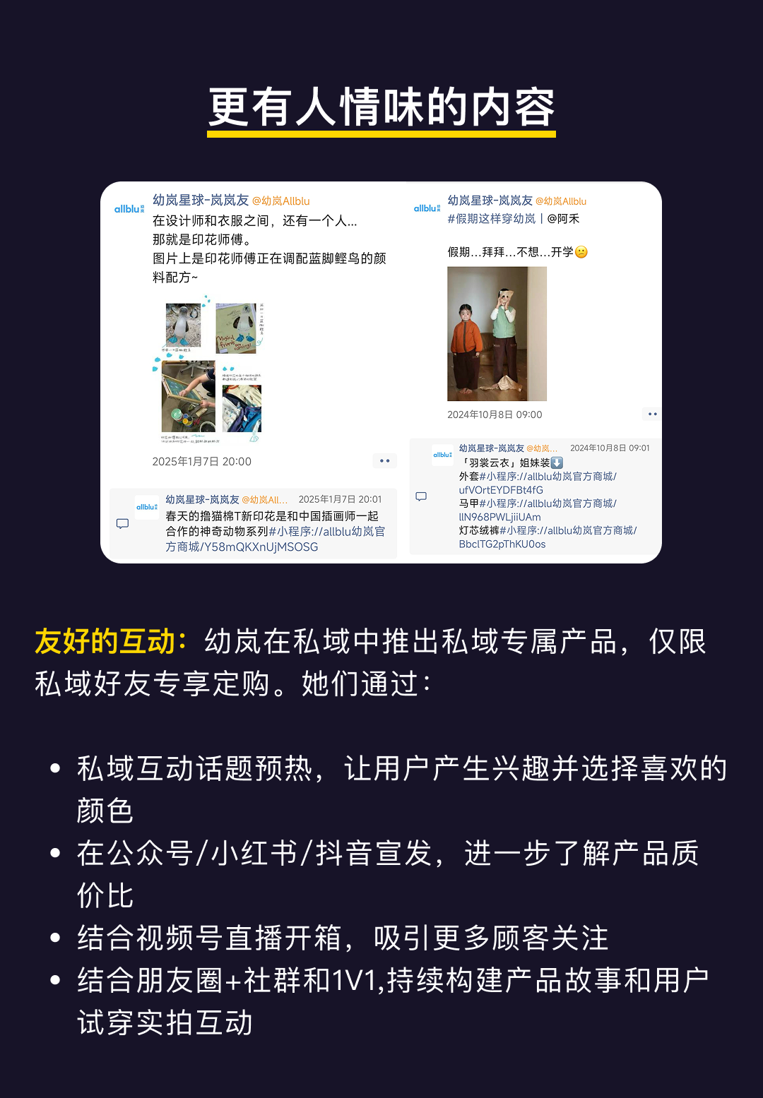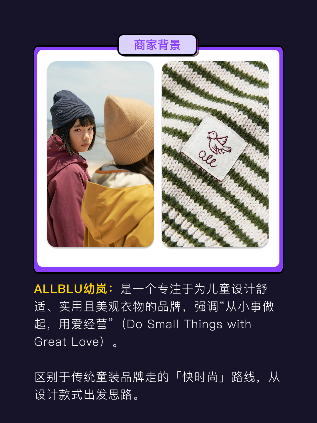分享一个特别有意思的童装品牌案例——ALLBLU幼岚。这个从天猫起家的本土品牌,用三年多的时间摸索出了一套线上线下融合的新玩法,尤其值得称道的是他们在私域运营上的创新突破。