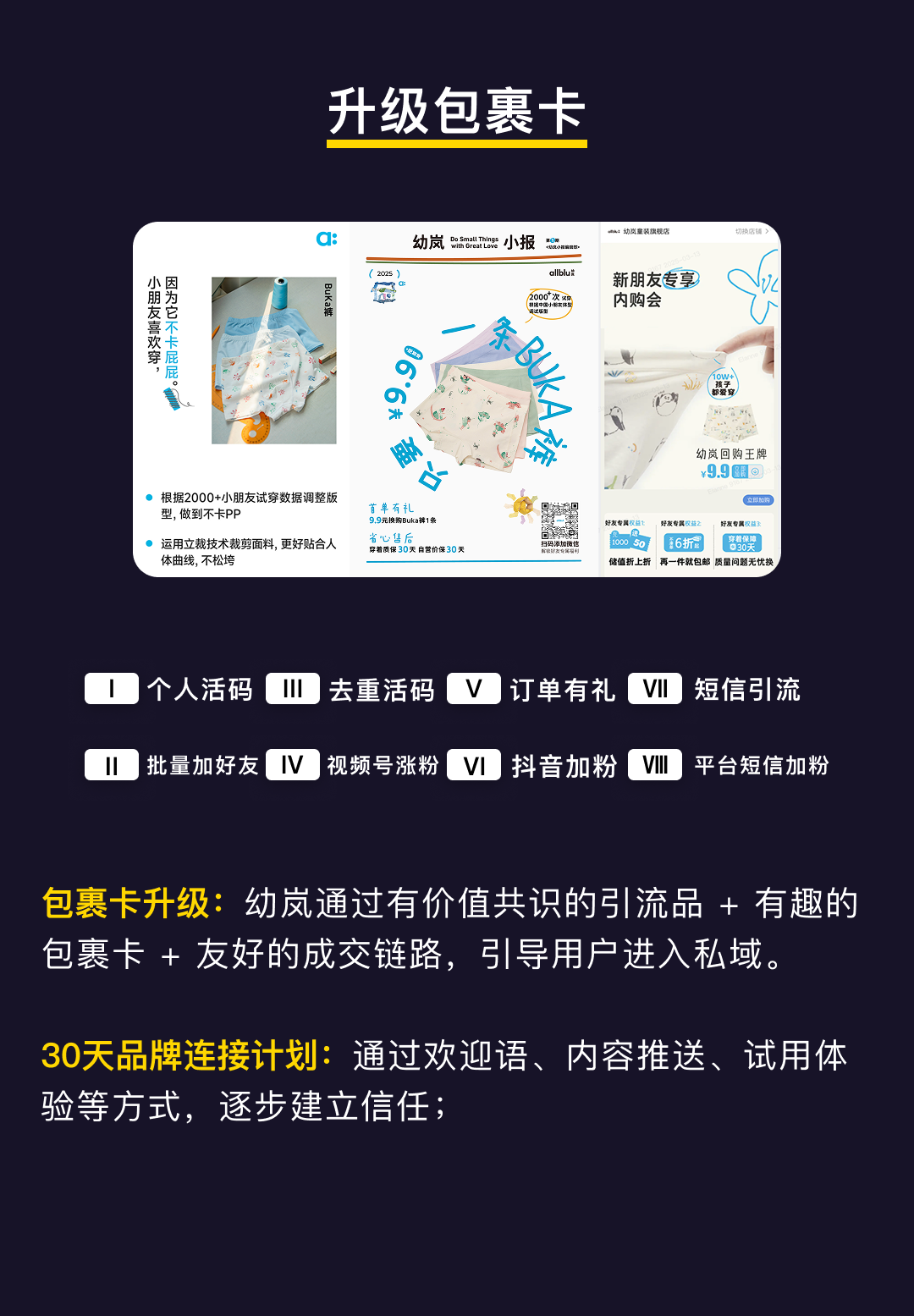 很多电商平台出身的品牌都会遇到这样的难题:线上线下必须保持统一售价时,私域该用什么吸引用户?幼岚给出了漂亮答案。他们不靠打折促销,而是精心设计了“30天品牌连接计划”。每次给用户寄送包裹时,都会附上一张充满童趣的卡片,上面既有穿搭建议又有品牌故事。就像给孩子准备了一份会说话的礼物,让家长在拆箱瞬间就能感受到品牌的用心。这种有温度的细节设计,成功把日常消费转化成了情感联结。