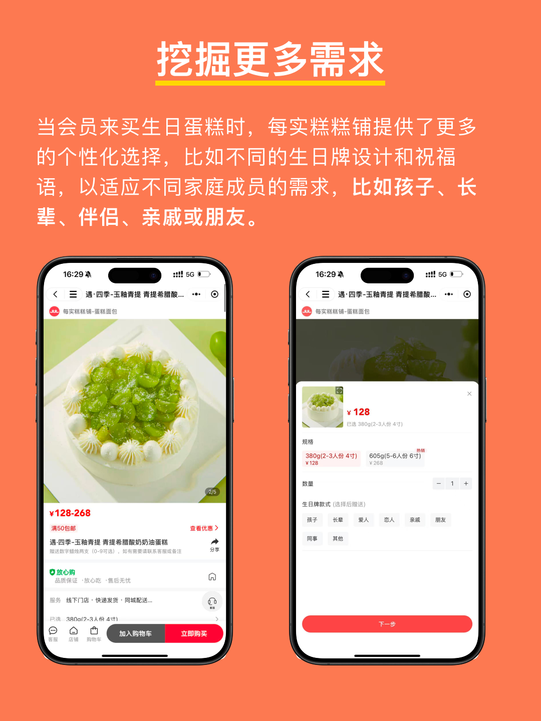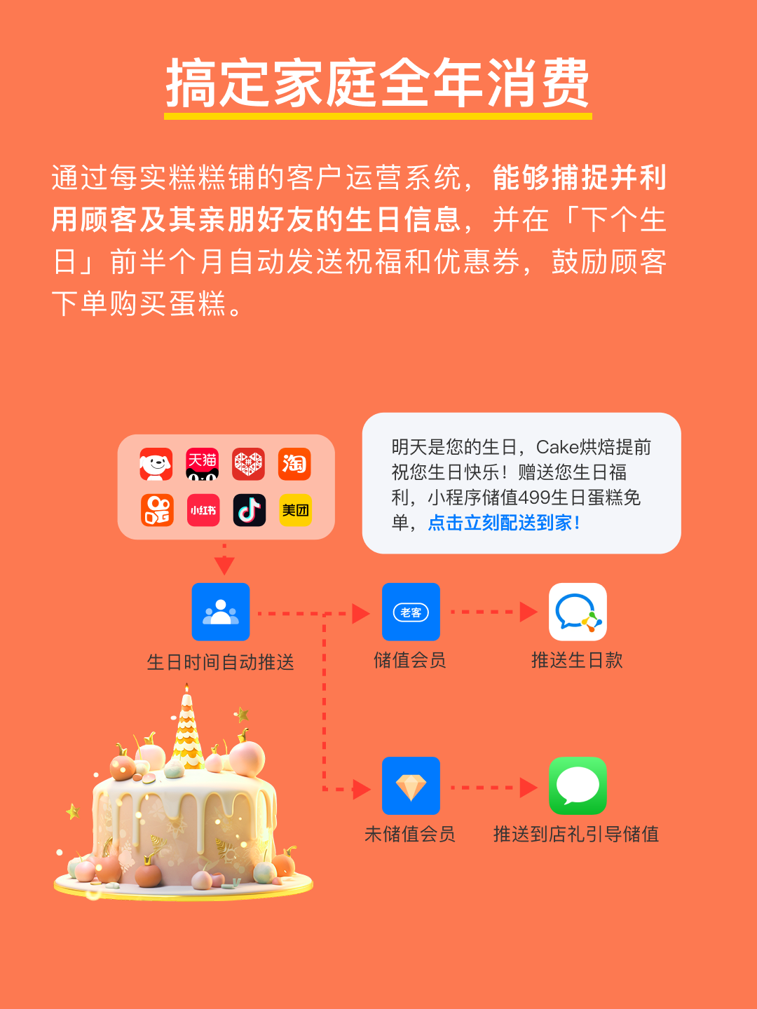 他们深知,每一位会员背后都是一个家庭,而家庭成员的生日、节日等特殊时刻都是销售蛋糕的绝佳机会。因此,他们在 CRM 系统中为每位会员搭建了详细的家庭关系网络,记录会员及其家人的信息。每当会员的家人或朋友临近生日,每实糕糕铺便会送上贴心的生日祝福,搭配当季特色蛋糕推荐和专属优惠券。这种精准的营销方式,使得忠实会员每年至少购买两次生日蛋糕,每位会员年度消费额轻松突破 1000 元。
