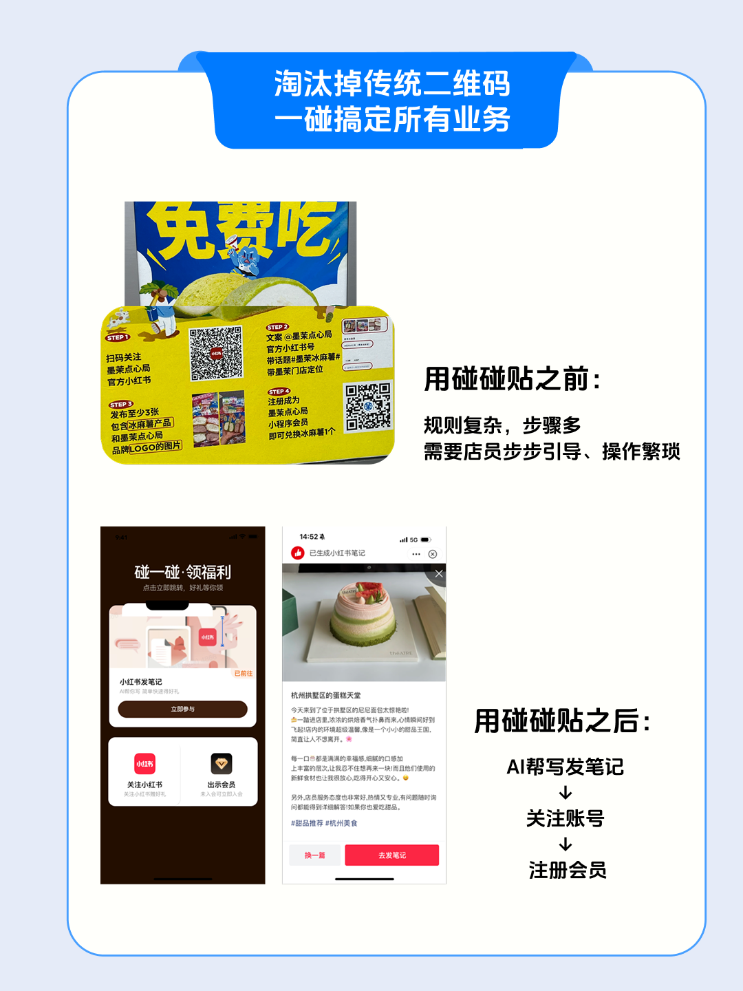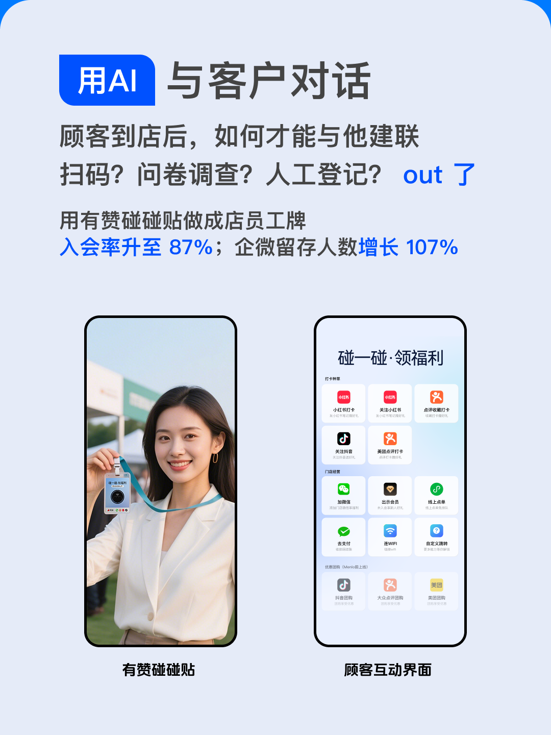 就拿有赞碰碰贴来说,替代了传统的二维码。顾客到店之后,不用再扫码关注、手动填资料,拿手机碰一下店员胸牌,立刻就能跳转到企业的微信、小程序会员页,甚至直接完成小红书关注和发帖任务。