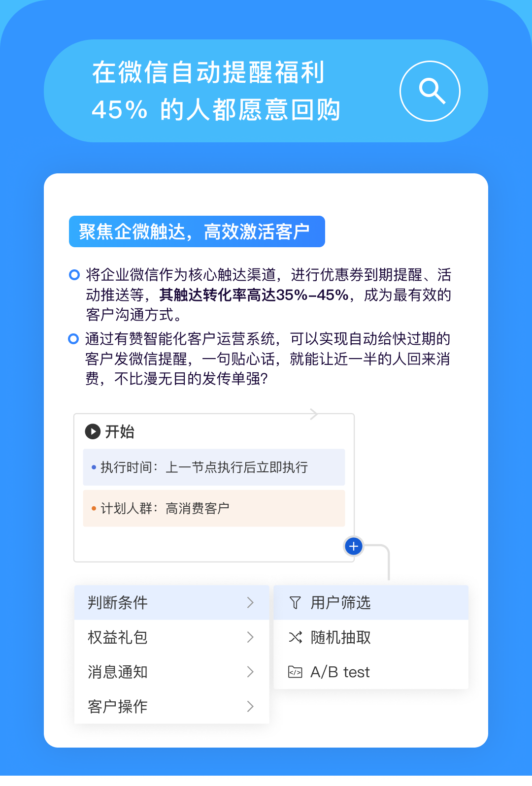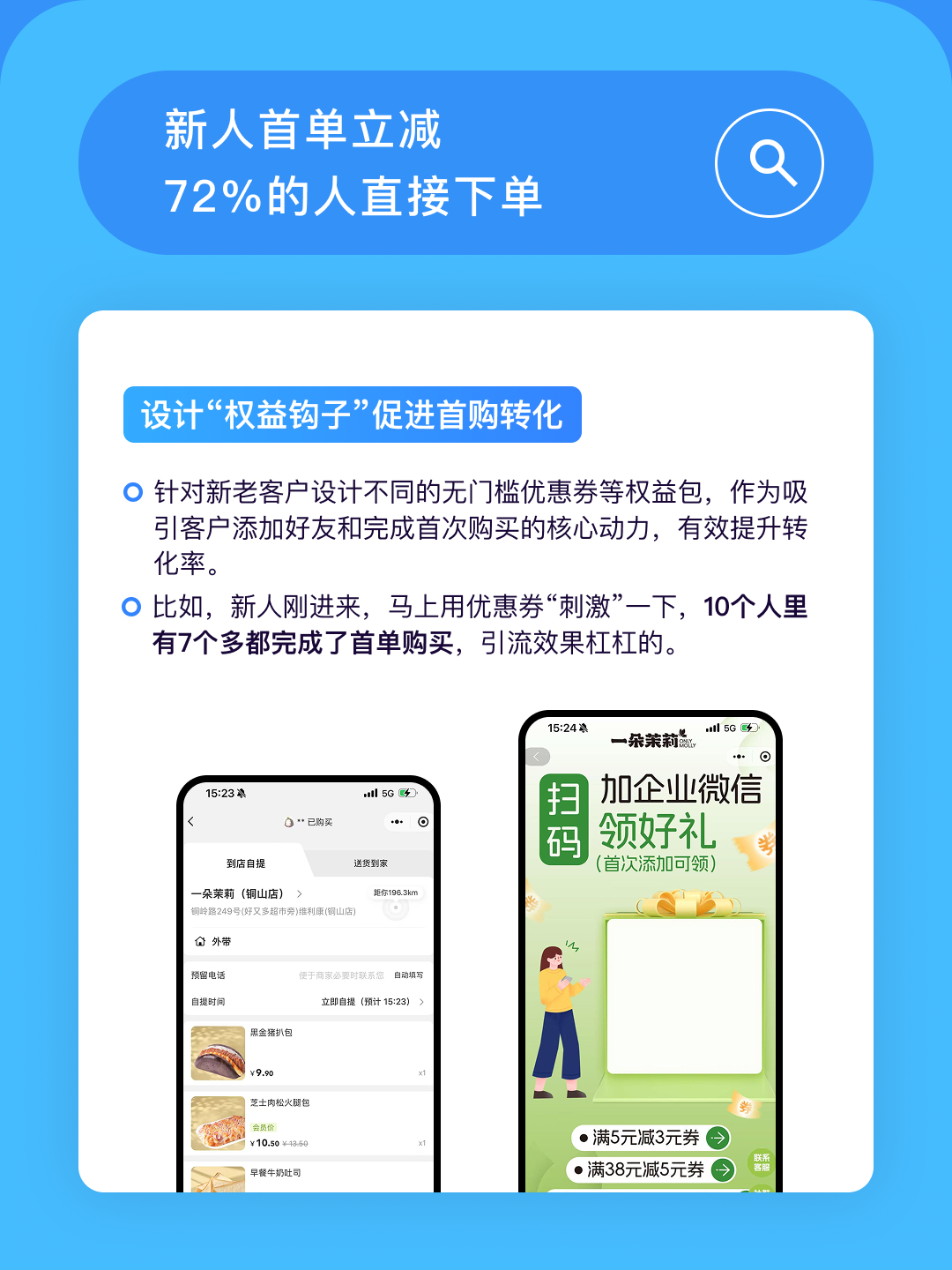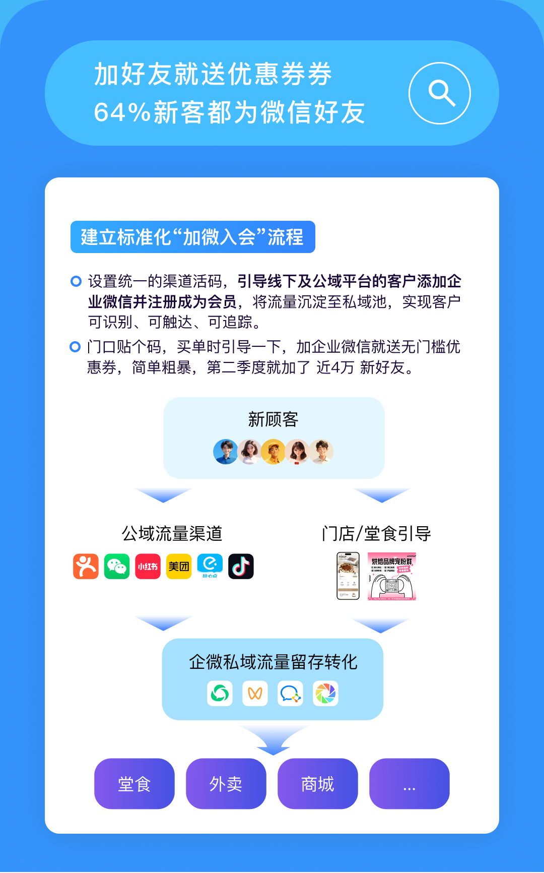 随后启动流量沉淀计划。在所有门店设置标准化引流流程,顾客扫描二维码即可添加企业微信并自动获得无门槛优惠券。该策略执行后,单季度新增企业微信客户近4万人,新会员添加率达到64%,首购转化率攀升至72%。