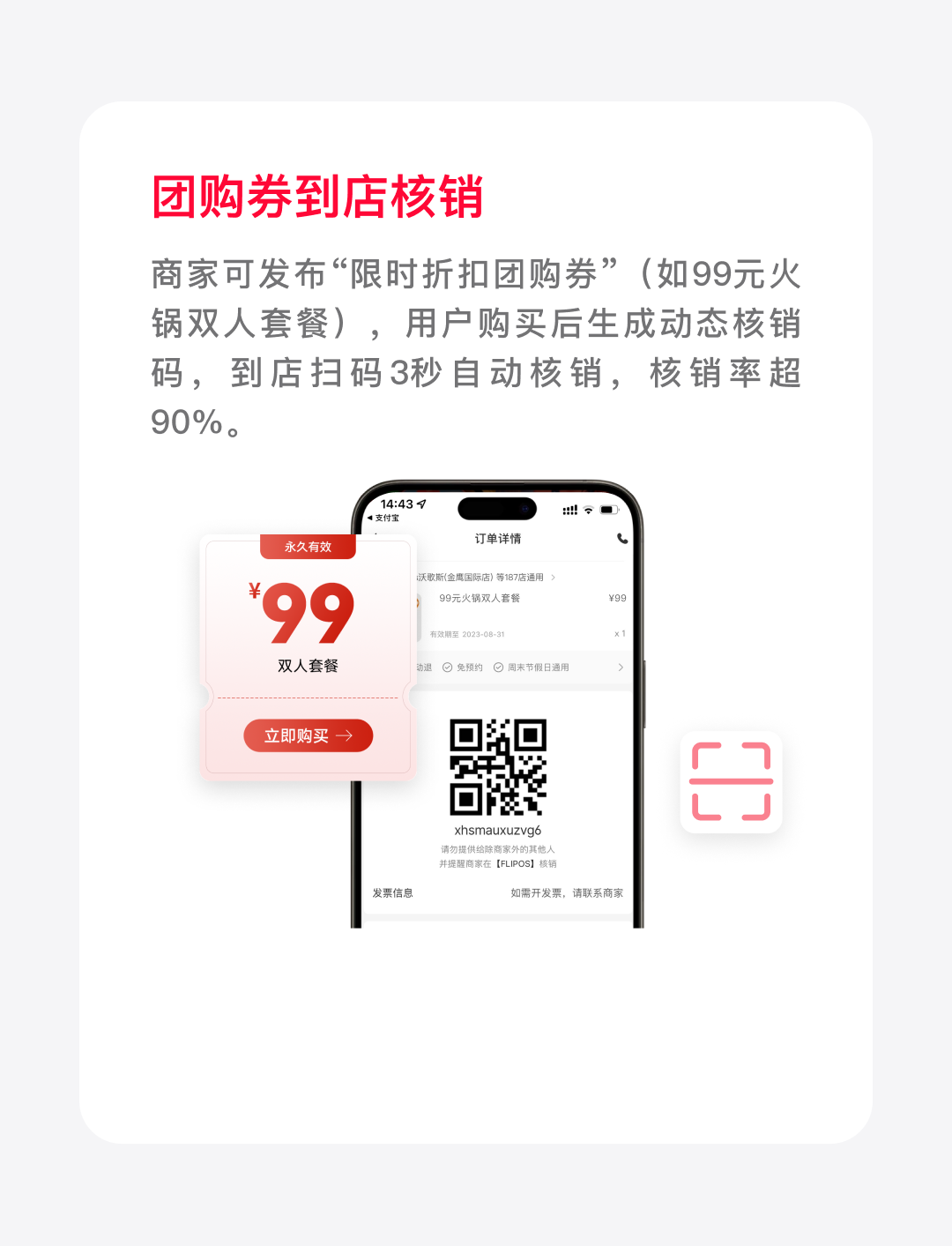 顾客在A店买券,B店也能核销,库存实时扣减,月底统一结算。