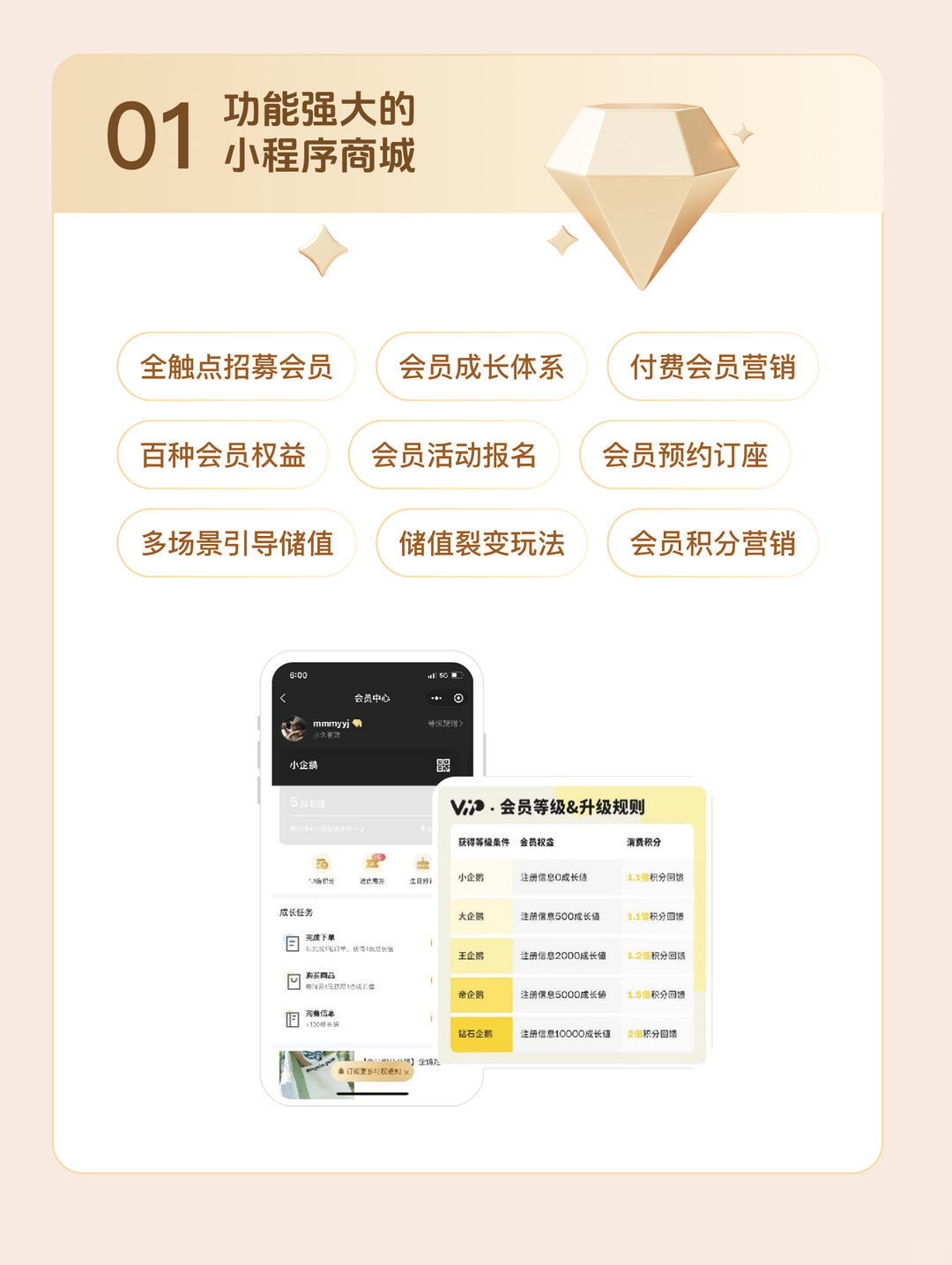 快速搭建高颜值专属小程序,1700+模板、40+组件自由搭配,0抽佣。集成会员注册、商城、储值、积分等功能,界面专业,提升品牌信任感。