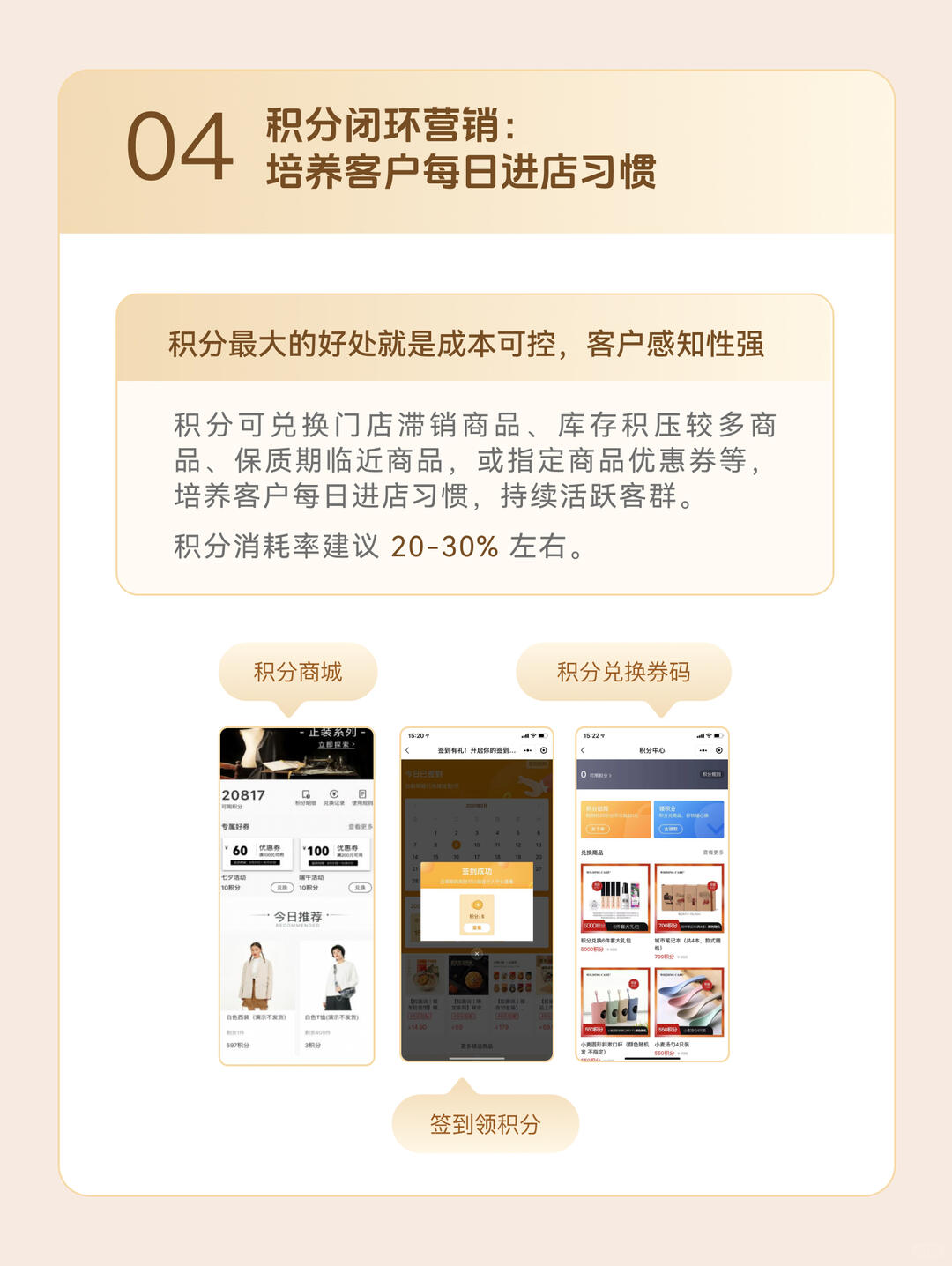 积分闭环营销:通过签到、任务赚积分,在积分商城兑换商品或优惠券,特别是可兑换临期、库存商品,成本低、感知强,有效培养客户每日进店习惯。