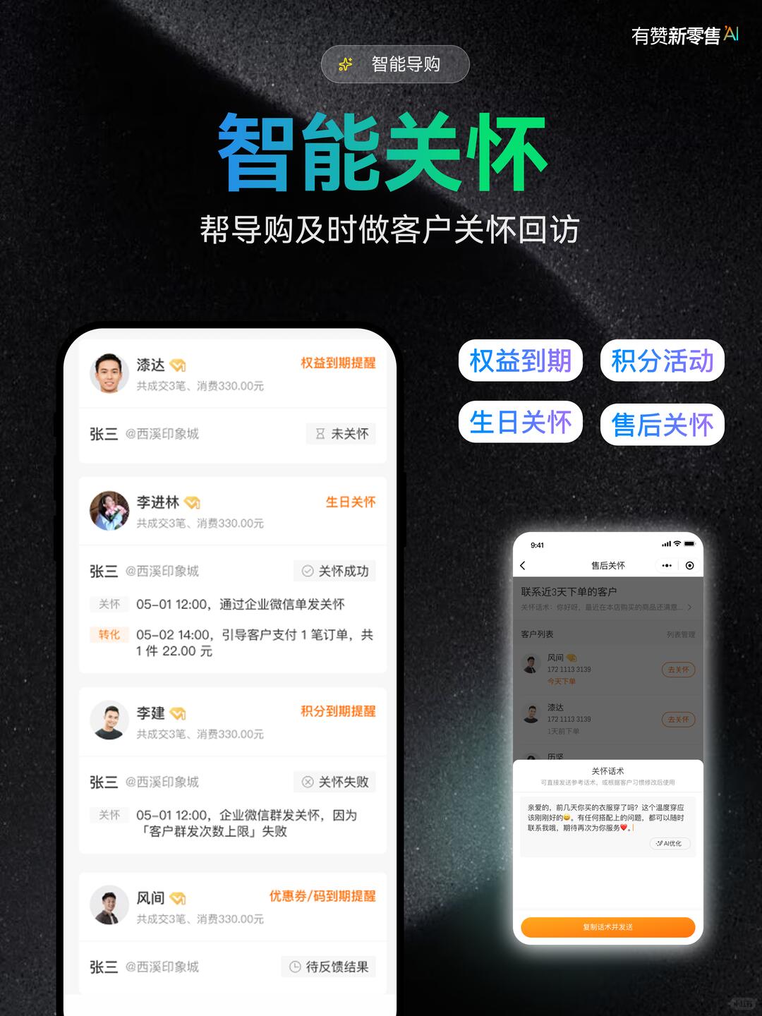 AI 精准捕捉生日、售后、权益到期等关键节点,自动提醒导购送上专属服务,暖心关怀不遗漏