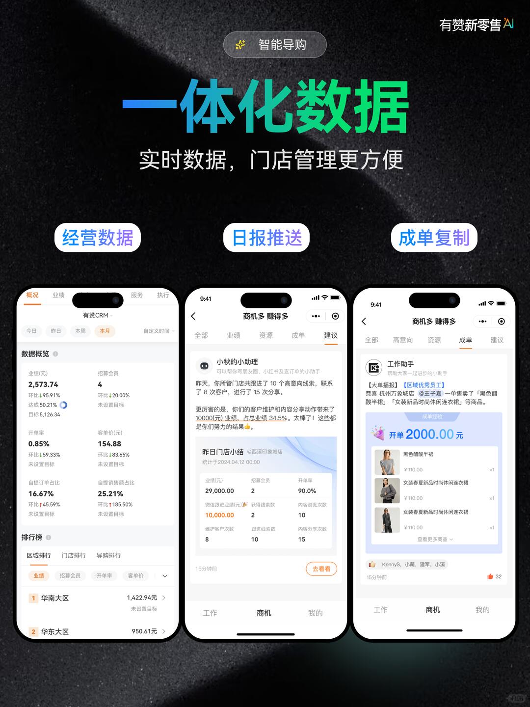 为管理者设定清晰目标,每日推送数据日报,同步优秀导购案例,大单成交可点赞转发,经验共享促团队成长!