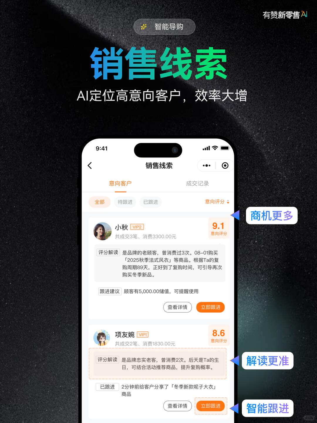 AI 深度分析客户信息,生成意向分从高到低排序,精准推送高潜线索,1 对 1 跟进不盲目,妥妥的导购业绩神器!