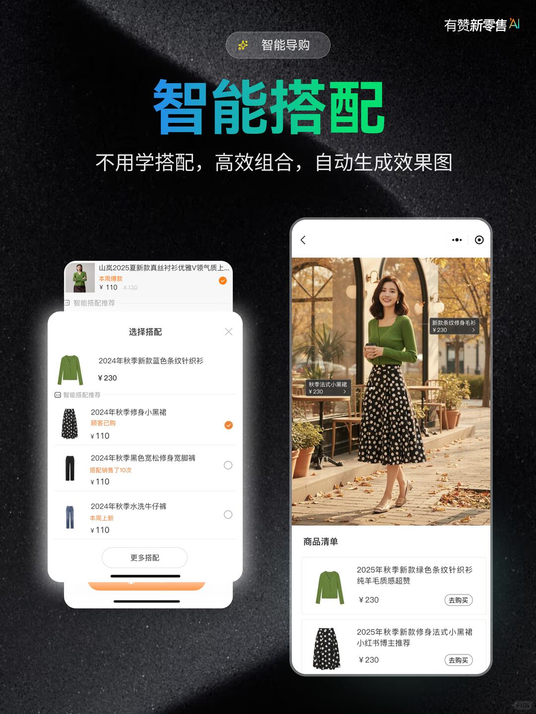 AI 大数据精准匹配推广商品 + 连带组合,自动生成场景化穿搭图,一键发给客户,连带率直线飙升!