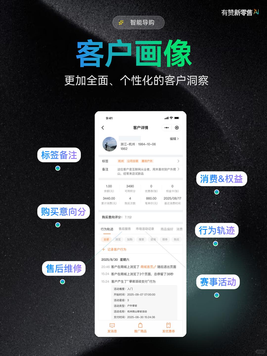 完整客户画像直观呈现,支持导入CRM不同行业的自定义行为数据,一线导购秒懂客户需求,服务高效又精准!