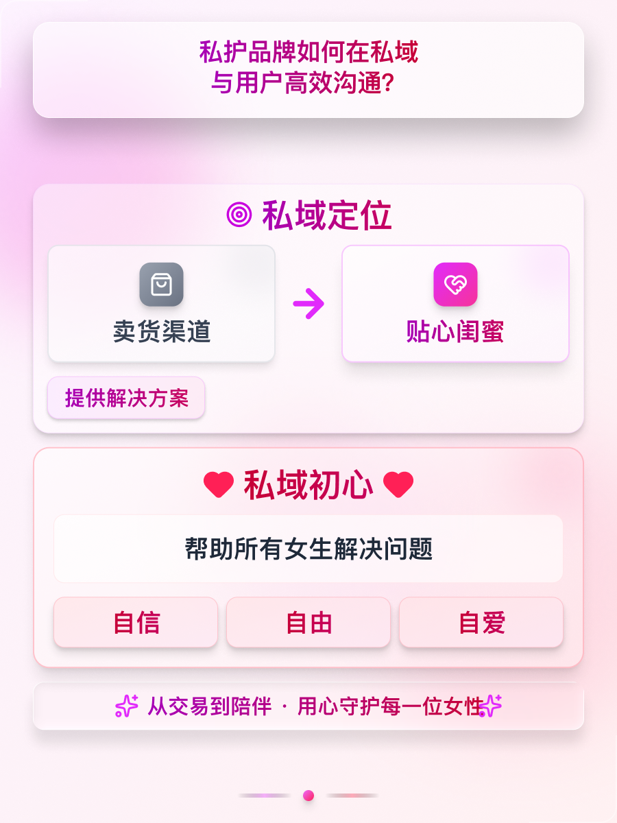 为突破困局,珂蔓朵将私域定位从"卖货渠道"转变为"贴心闺蜜",核心是为用户 提供解决方案,帮助女生实现自信、自由、自爱。品牌发现消费者真正需要的不是产品,而是看得懂的综合解决方案,因此私域初心是守护每一位女性,从交易走向陪伴。