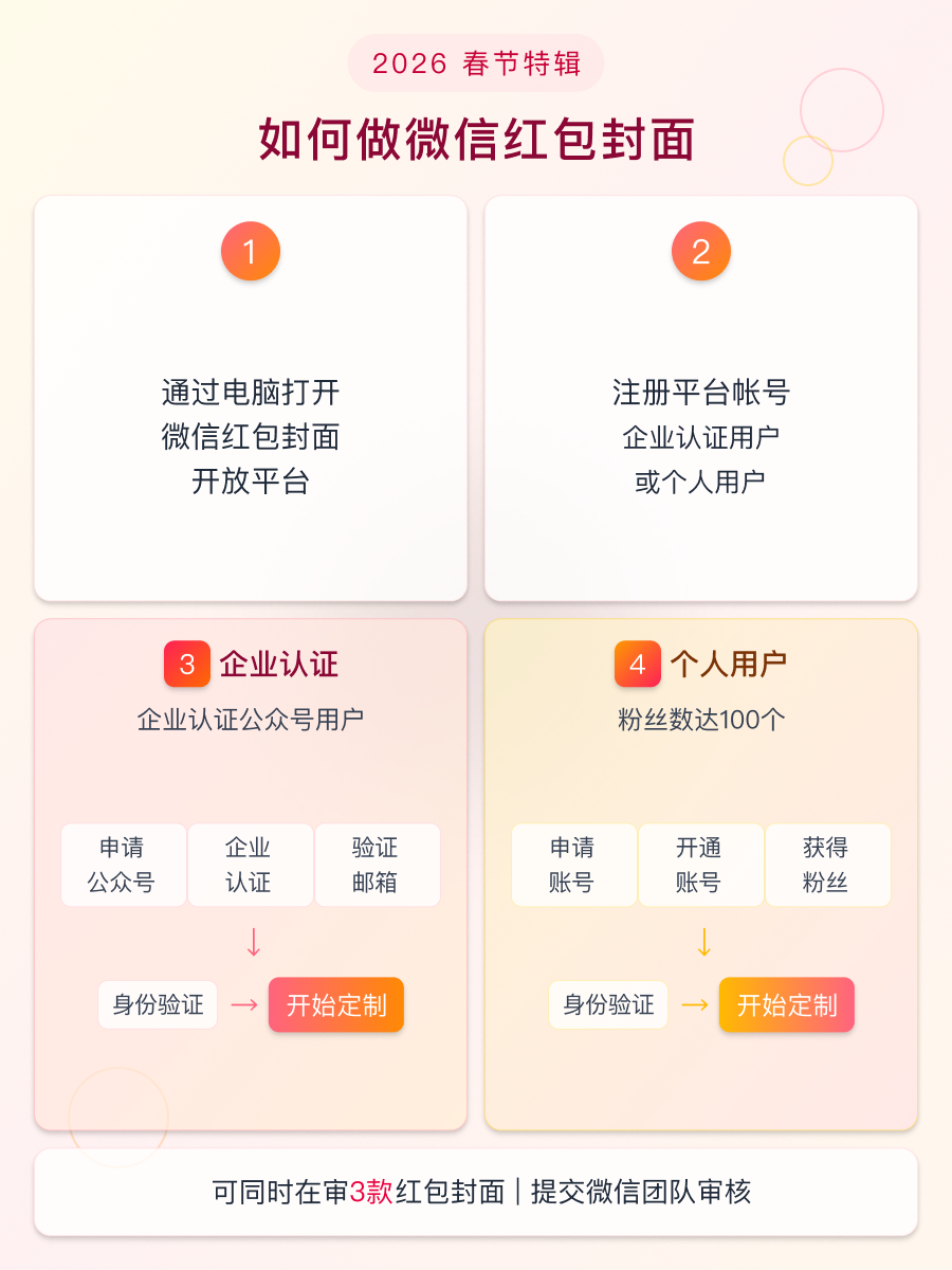定制一款红包封面,首先需要公众号注册平台帐号,目前微信推出了企业认证用户和个人用户两种主要类型的用户账号,供你选择。
