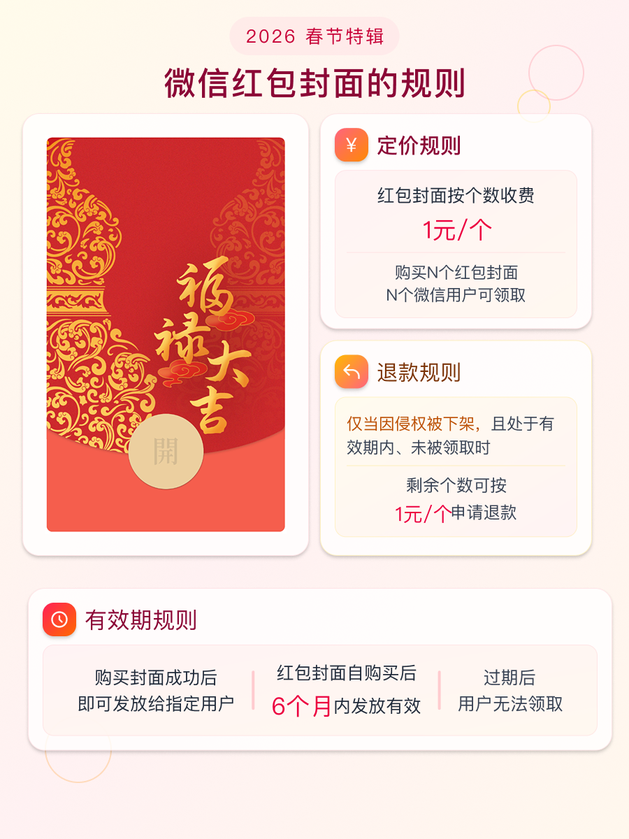 退款:仅当红包封面因侵权被下架,且存在尚处于发放有效期内、未被任何用户成功领取的红包封面时,剩余的红包封面个数可按照1元/个申请退款。