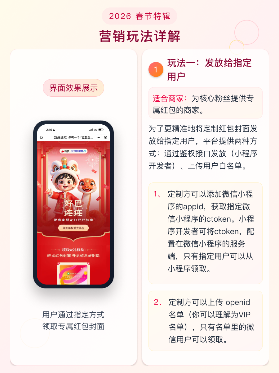 玩法一:发放给指定用户,比如配置在微信小程序的服务端,只有指定用户可以从小程序领取,只有名单里的微信用户可以领取。