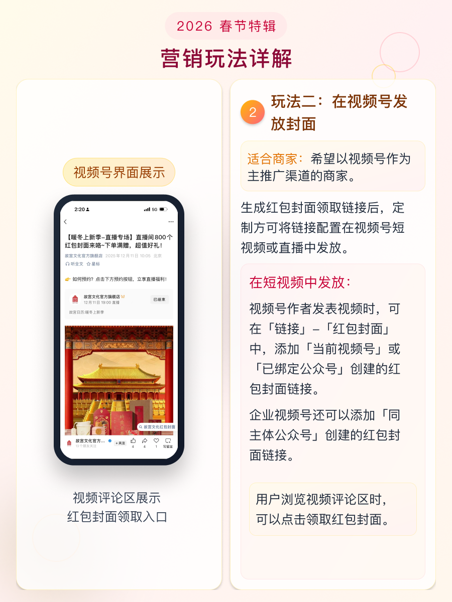 玩法二:生成红包封面领取链接后,定制方可将链接配置在视频号短视频或直播中发放。