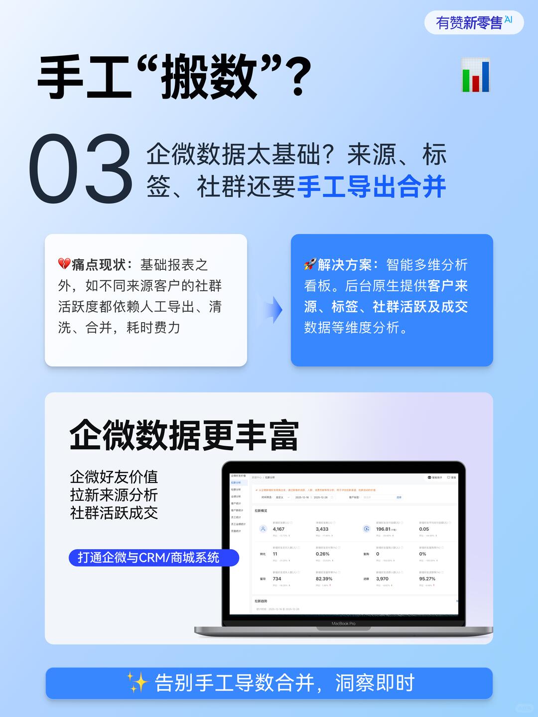 🚀 解决方案:后台原生提供客户来源、标签、社群活跃及成交数据等维度分析。
