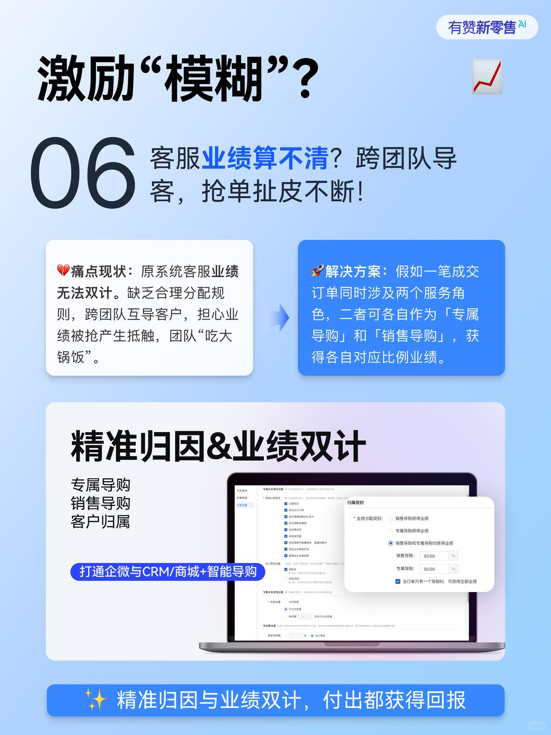 🚀 解决方案:精准归因与业绩双计。假如一笔成交订单同时涉及两个服务角色,二者可各自作为「专属导购」和「销售导购」,获得各自对应比例业绩。