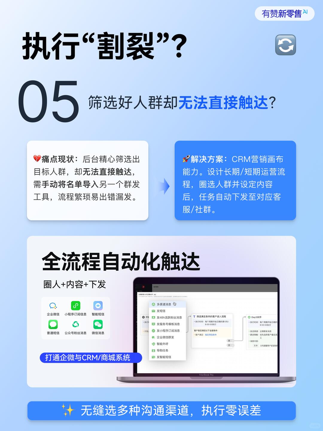 🚀 解决方案:CRM营销画布能力。设计长期/短期运营流程,圈选人群并设定内容后,任务自动下发至对应客服/社群,无损执行。