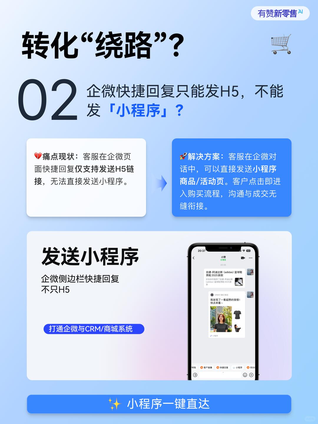 🚀 解决方案:小程序一键直达。客服在企微对话中,可直接发送小程序商品/活动页。