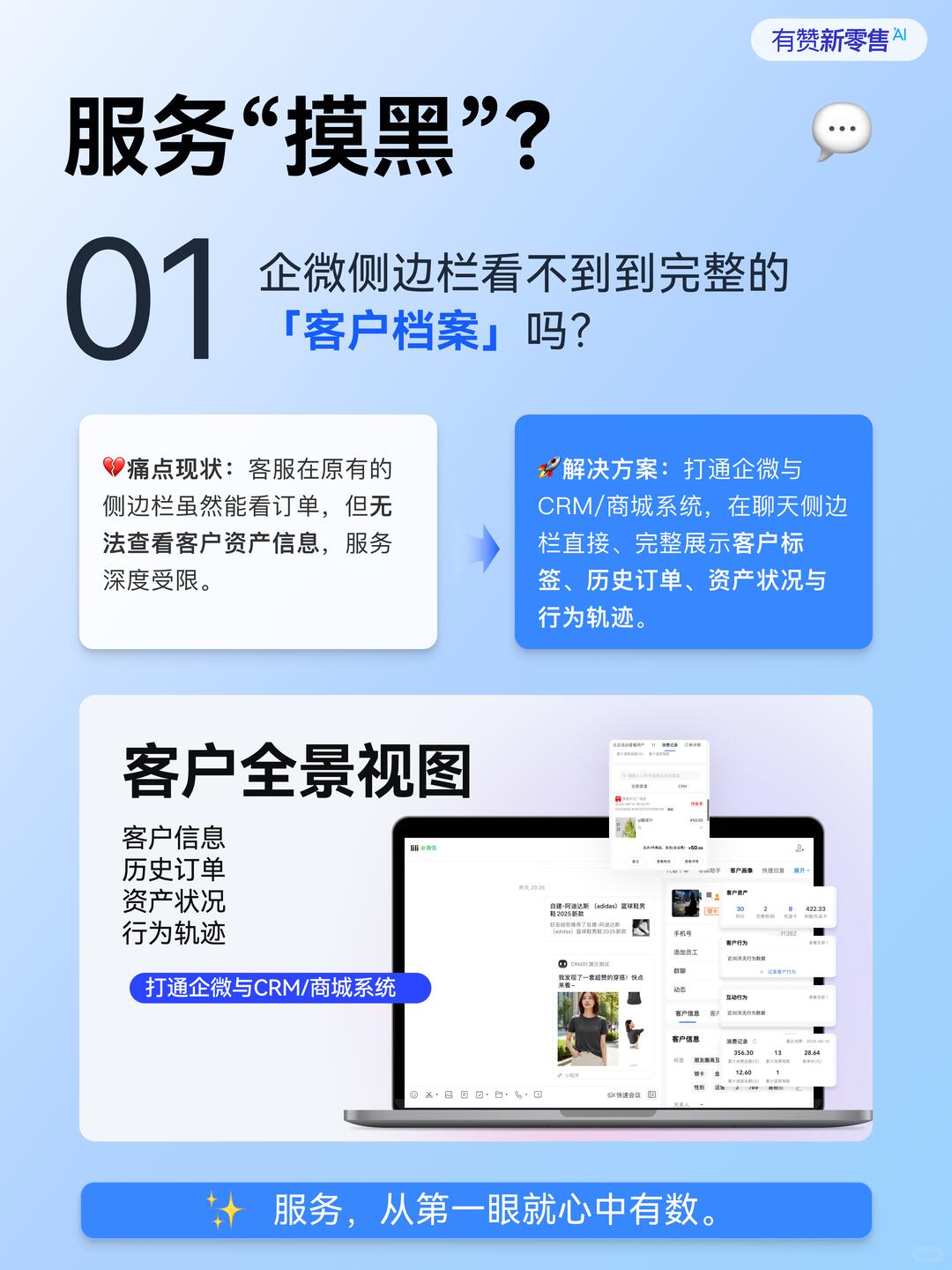 🚀 解决方案:打通企微与CRM/商城系统,聊天侧边栏直接、完整展示客户标签、历史订单、资产状况与行为轨迹。