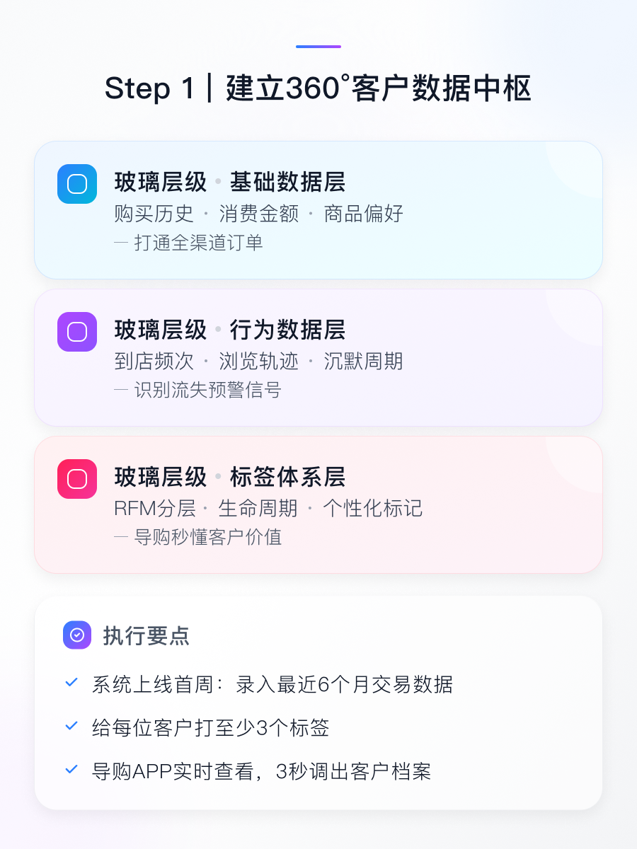 Step1:搭建客户数据中枢 🔍 打通全渠道订单,建立360°客户档案,涵盖购买历史、消费偏好、到店周期与RFM分层标签。执行首周必须完成近6个月交易数据录入,确保导购3秒内可调取客户档案。系统上线后,沉默客户识别准确率需达90%以上,为后续触达提供精准靶点。