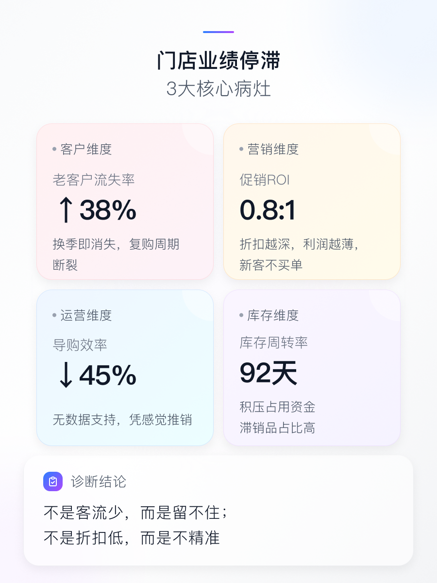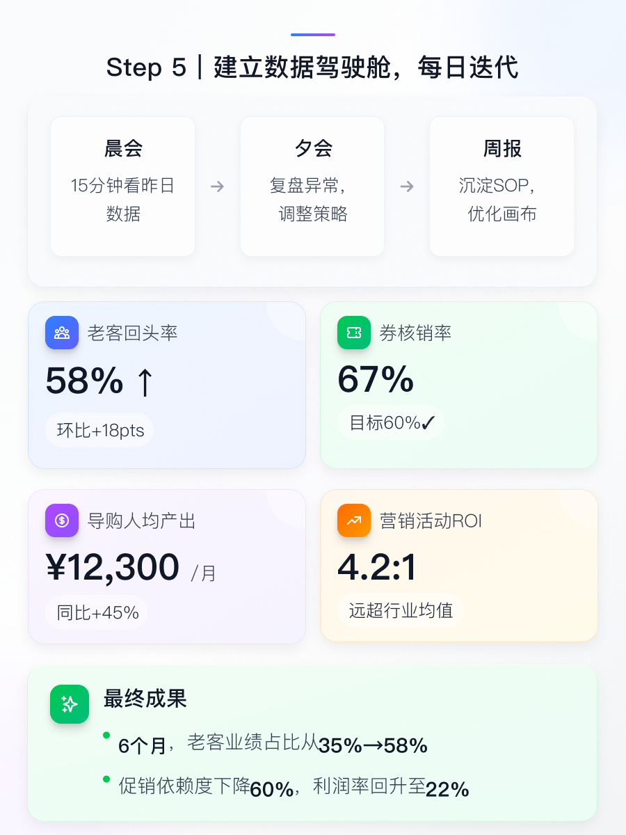 Step5:建立数据驾驶舱 📊 每日晨会15分钟复盘核心指标:老客回头率、券核销率、导购人均产出、营销活动ROI。6个月迭代周期内,老客业绩占比从35%提升至58%,促销依赖度下降60%,利润率回升至22%。数字化工具的价值不在于功能堆砌,而在于将数据转化为可执行的、有温度的服务动作。