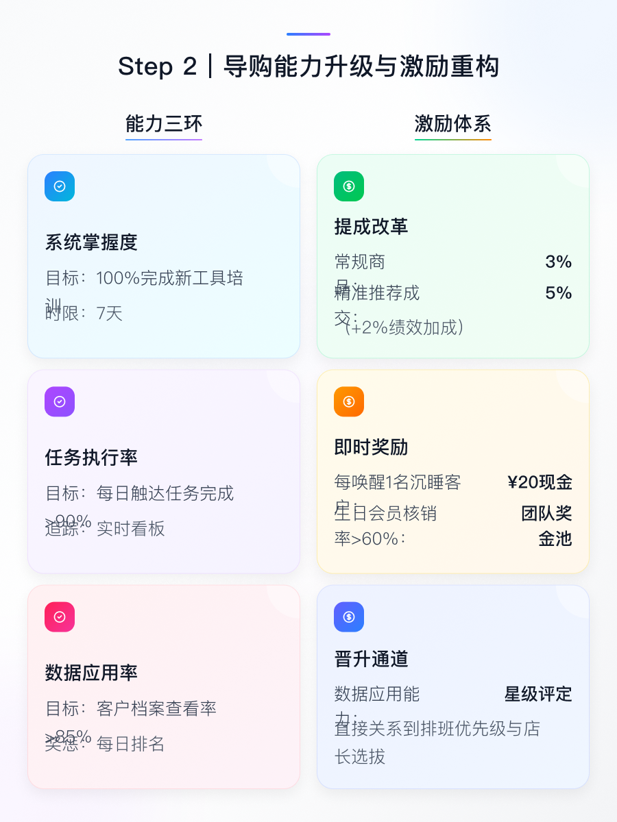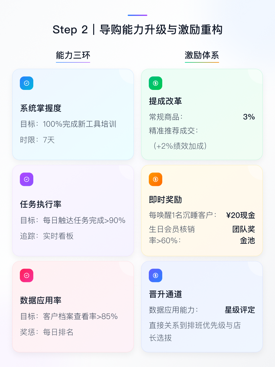 Step2:激活团队战斗力 💪 7日内完成100%导购新工具培训,建立"数据应用率→任务执行率→转化率"三环追踪体系。改革提成结构:常规商品佣金3%,精准推荐成交提升至5%;每唤醒1名沉睡客户奖励20元即时现金。将数据能力纳入星级评定,直接与排班优先级及晋升通道挂钩,头部导购关怀业绩占比可达总业绩30%。