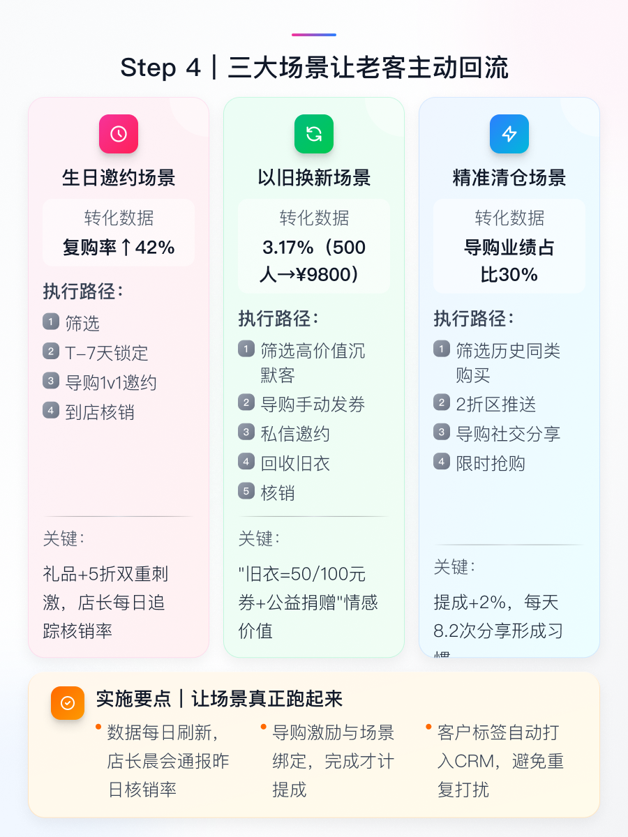 Step4:三大场景精准爆破 🎯 生日邀约场景:提前7天锁定名单,导购1v1私信触达,提供5折+赠品双重刺激,店长每日晨会追踪核销率,复购率可提升至42%🎂