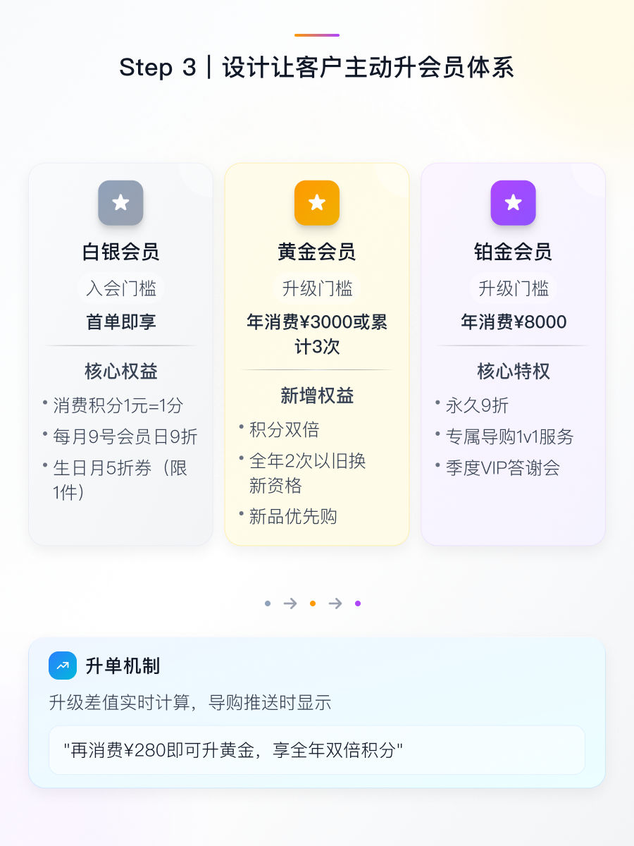 Step3:重构会员价值体系 👑 设计三级会员架构:白银会员首单即享,核心权益为消费积分与生日月5折券;黄金会员年消费满3000元,新增全年2次以旧换新资格与双倍积分;铂金会员年消费8000元,提供永久9折与1v1专属导购服务。关键机制在于实时计算升级差值,推送时显示"再消费280元即可升黄金",刺激主动升单。