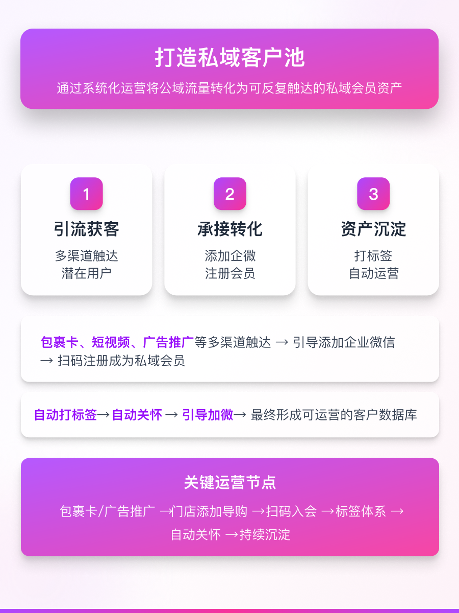 【流量转化模型】 公域曝光 → 企业微信承接 → 会员标签体系 → 自动化运营