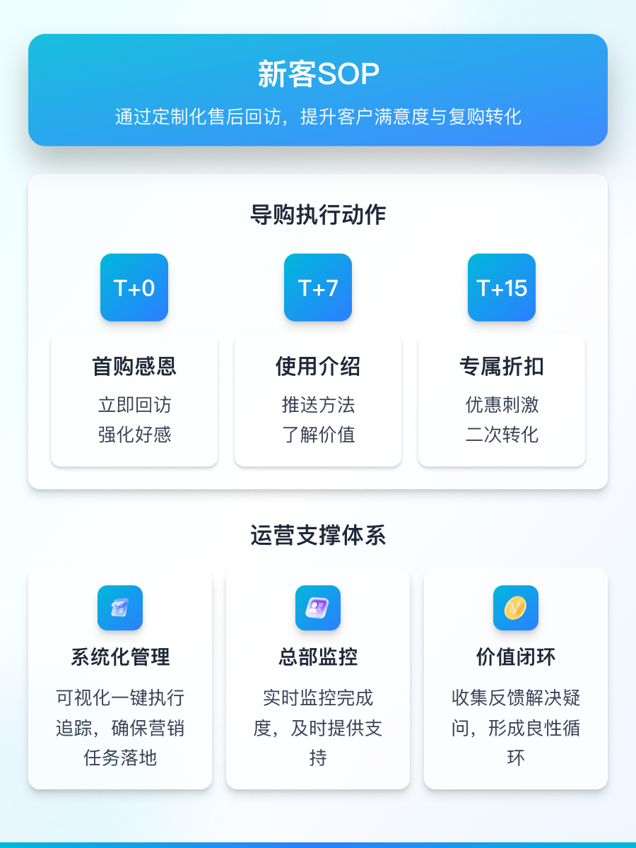 【新客运营SOP】 T+0:感恩回访(建立信任) T+7:使用指导(强化价值感知) T+15:专属折扣(二次转化钩子)