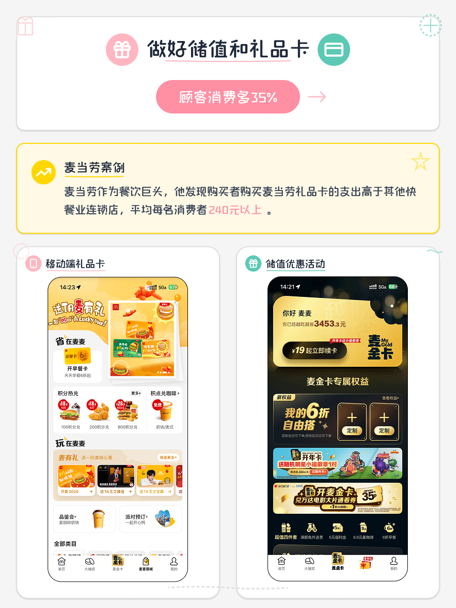 2️⃣ 麦当劳的储值策略麦当劳礼品卡用户年均消费240元,远高于普通用户。关键在于:储值送徽章、送限定周边,把支付行为变成收藏行为;"越吃越省"的实时进度提示,在小程序首页不断强化省钱感知。数据显示,做好储值和礼品卡,能让顾客消费额外提升35%