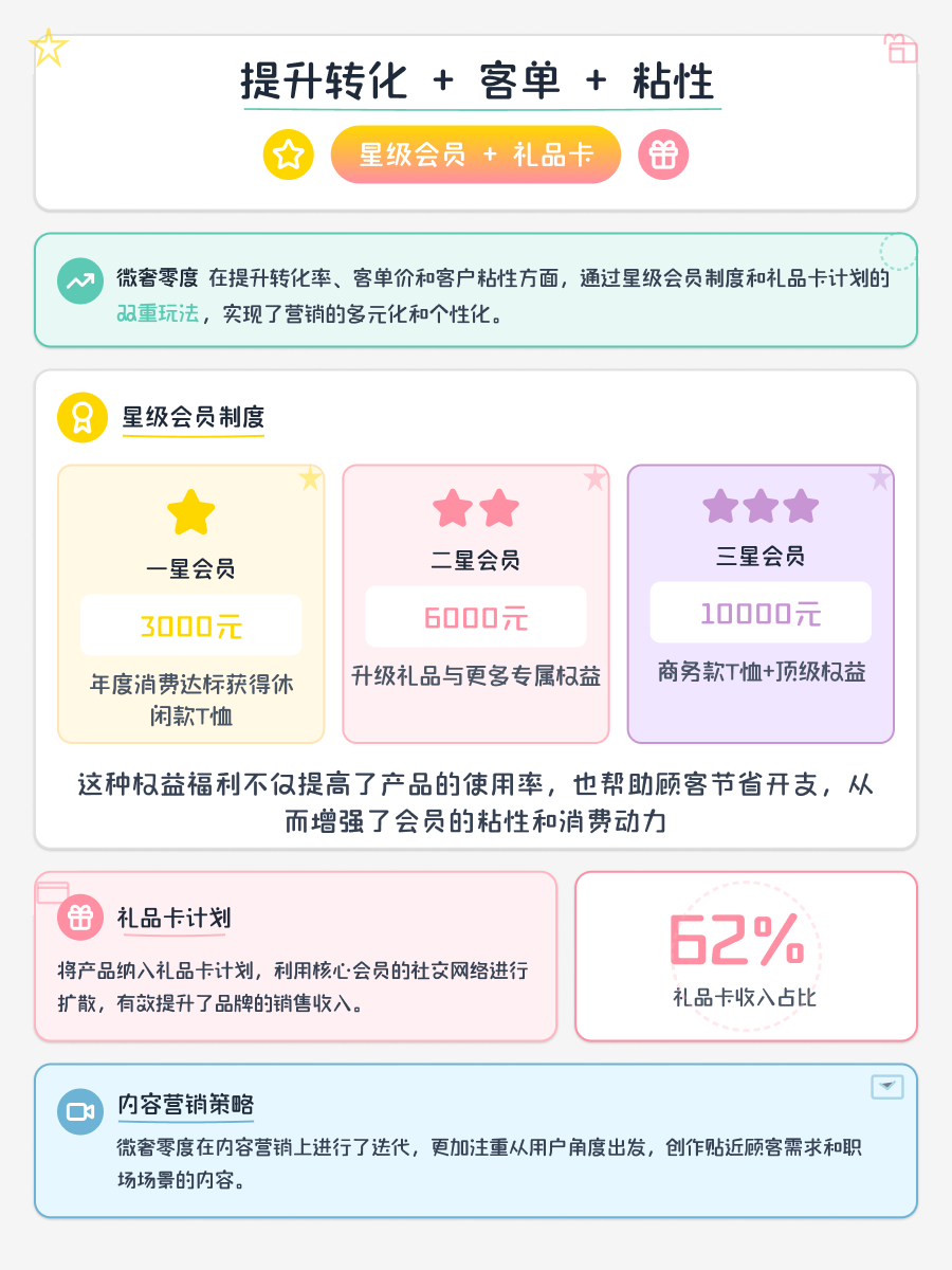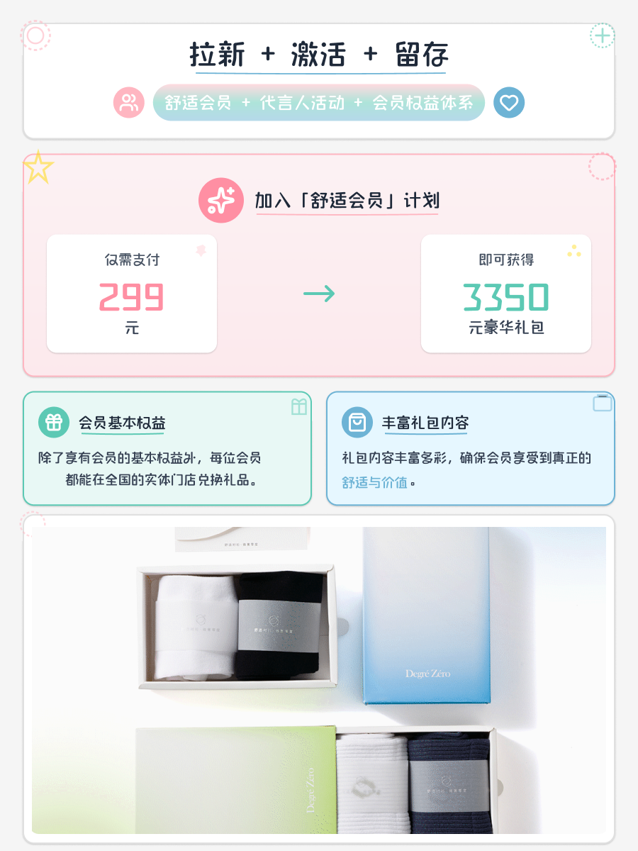 1️⃣ 微奢零度的组合拳舒适会员:299元入会,送3350元实物礼包(运动套装+8内裤+8袜子),直接击穿价值感知。核心策略是用高货值产品组合覆盖会费,让客户感觉"占了大便宜"礼品卡占比62%💡:将会员权益产品化,做成可赠送的礼品卡,利用核心客户社交关系完成裂变。礼品卡的本质是让客户帮你销售
