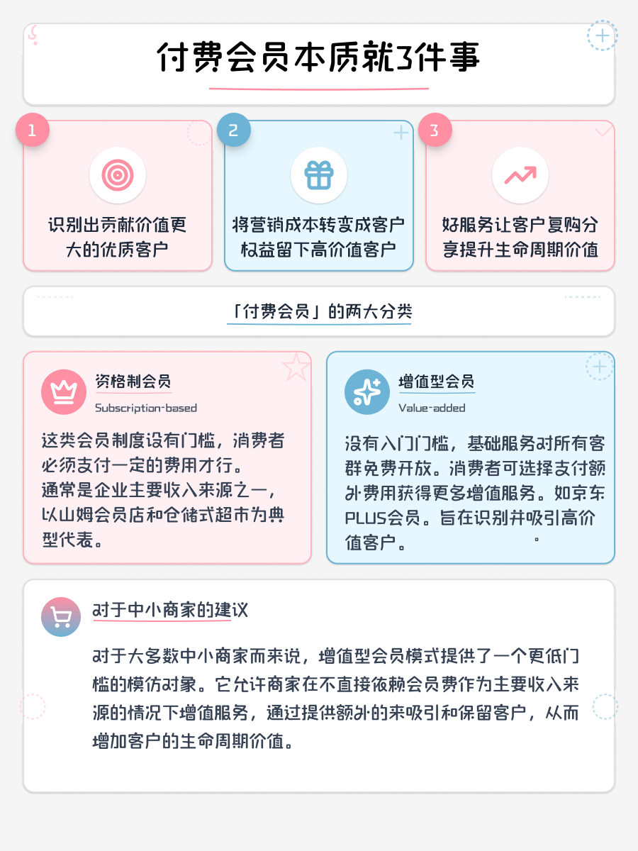 一、先厘清本质:付费会员=筛选高价值客户+转化营销成本两种模式:资格制会员:像山姆,付年费才有进场资格,会员费是核心利润增值型会员:像京东PLUS,基础服务免费,付费解锁专属权益核心逻辑是把原本要花在广告投放的预算,直接转化成客户能感知的权益和服务。与其花钱请代言、买流量,不如把钱花在认可你的客户身上,让他们持续复购并主动传播。